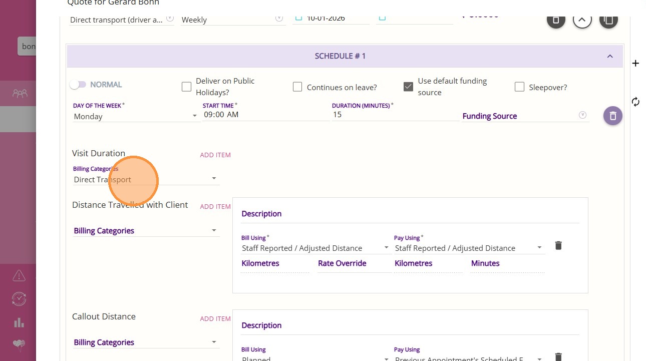 3. For Visit Duration, select the Direct Transport billing category.