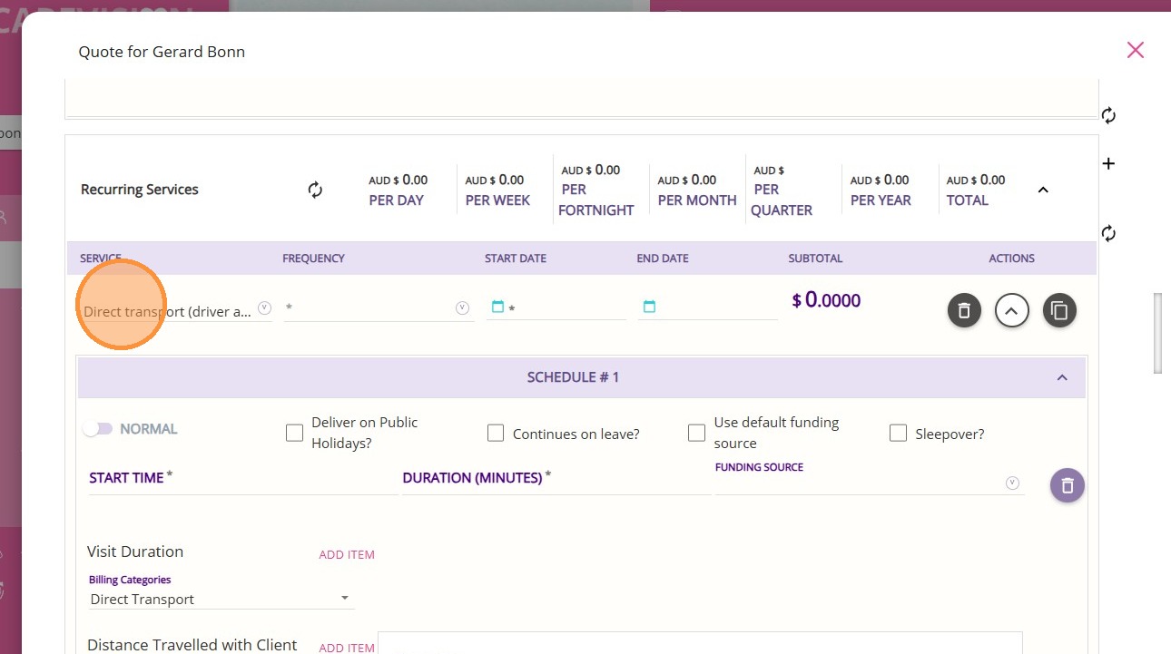 1. When preparing a quote for a client, go to the Service section. In this example, a Direct Transport service will be added under the Recurring Services section.