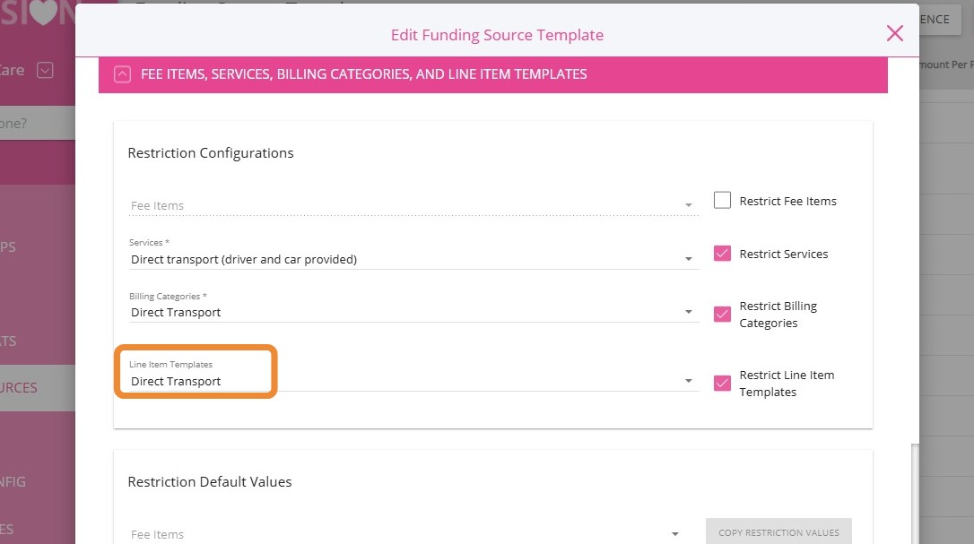 6. Under Line Item Templates, link the relevant Line Item Templates for Transport. Click the Restrict Billing Categories box to ensure that only the Line Item Templates you selected will be available under the funding source.