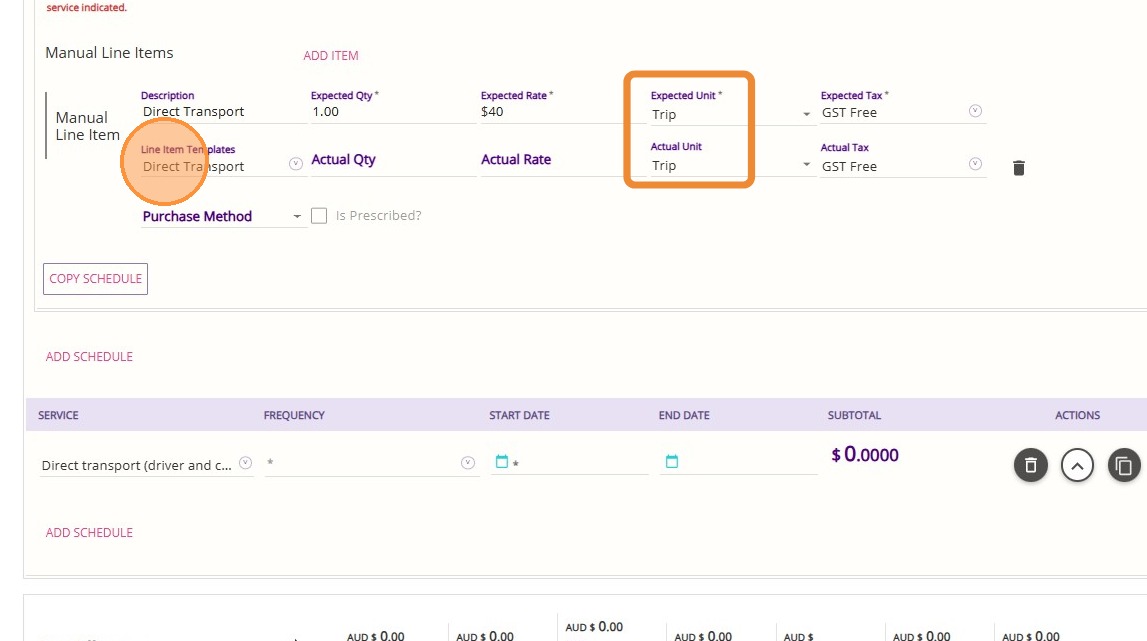 7. Select the Manual Line Item Template for Transport (for example, Direct Transport) where the Expected Unit and Actual Unit fields are set to Trip as set up in the template.