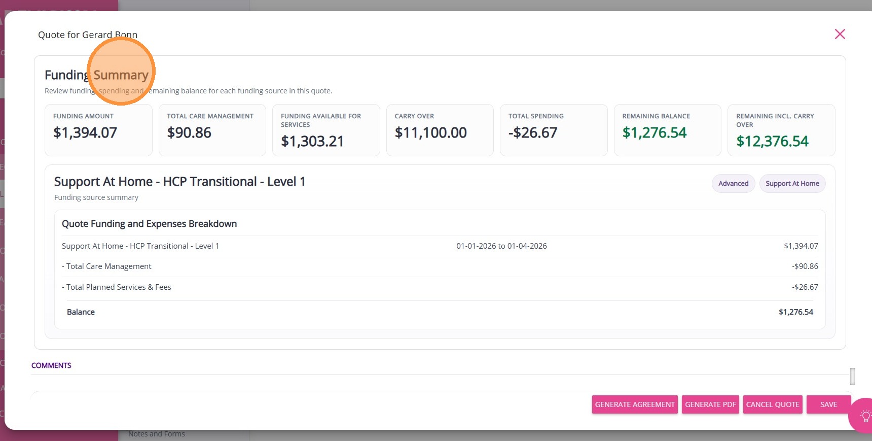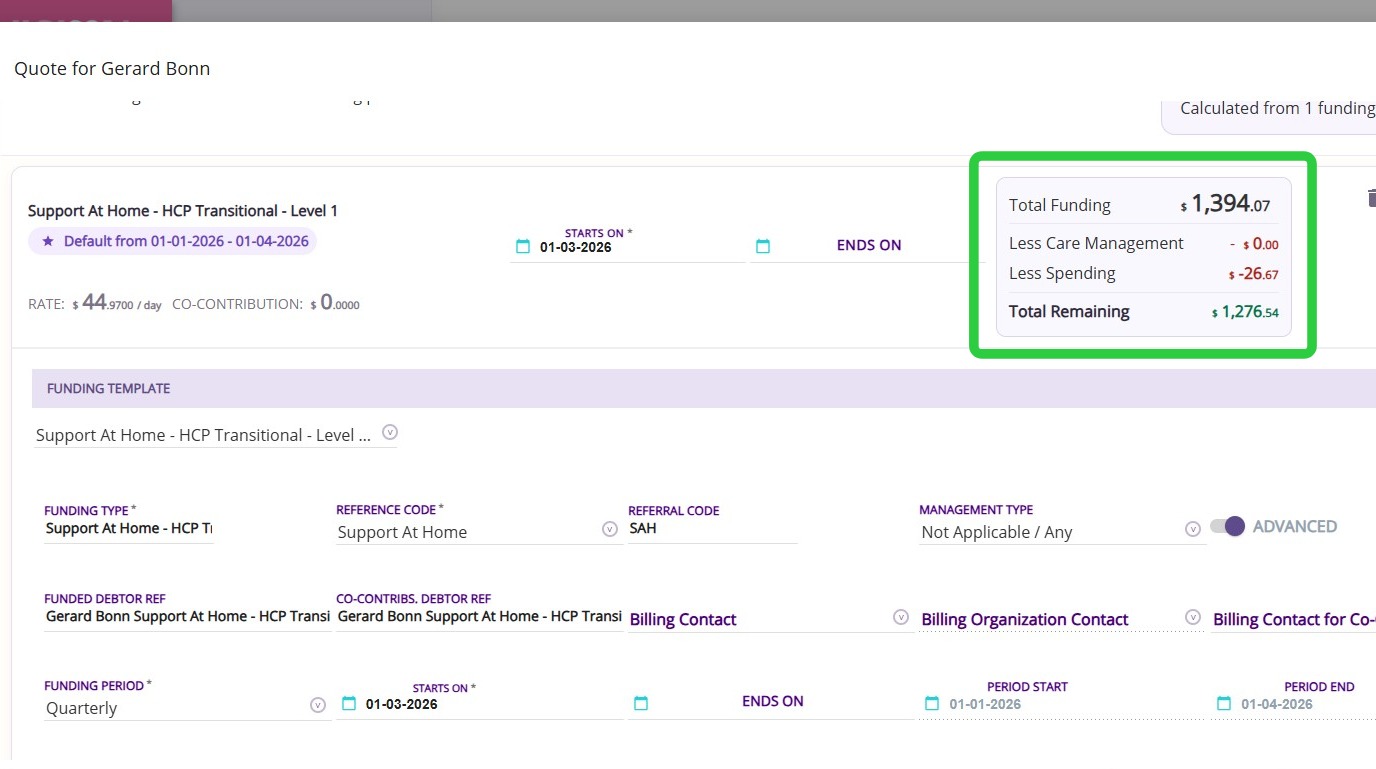 You can now view total spending on services in the Fund Sources section. The system shows a card with total funding, less spending, less care management, and total remaining balance so you can track how much funding the client has and what remains after quoted services.