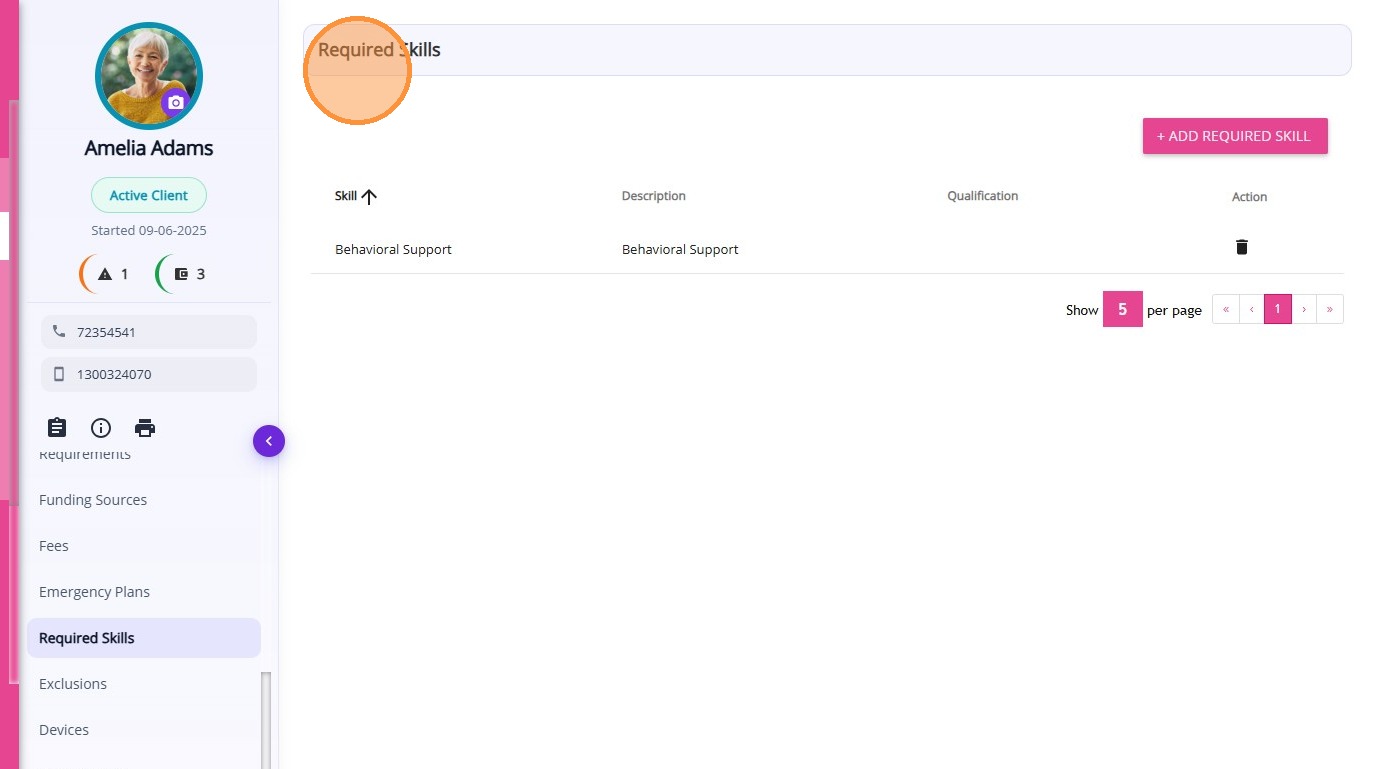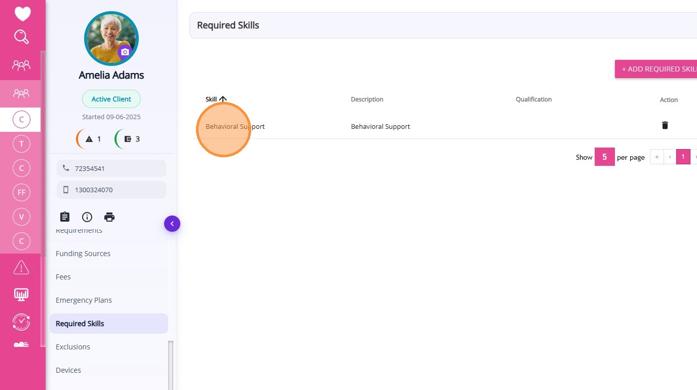 The Required Skills section in the Client Profile displays all skills required for staff who deliver services to the client. This allows organisations to specify special skills or attributes that staff must have when delivering services to a particular client.