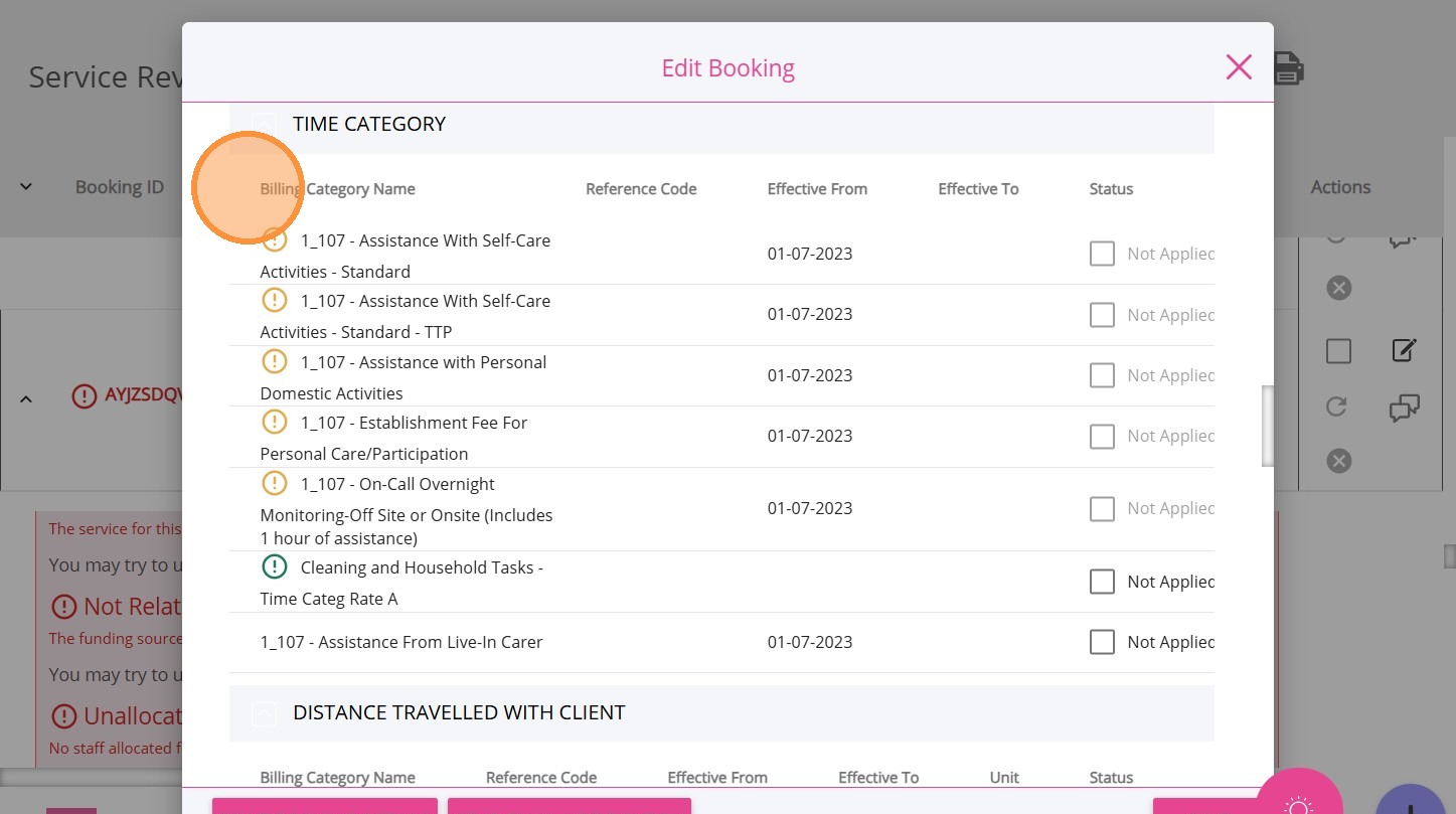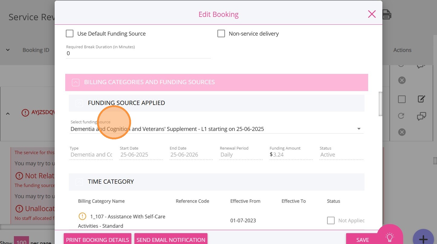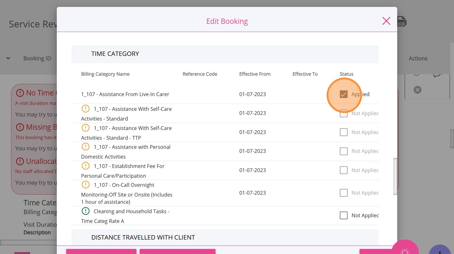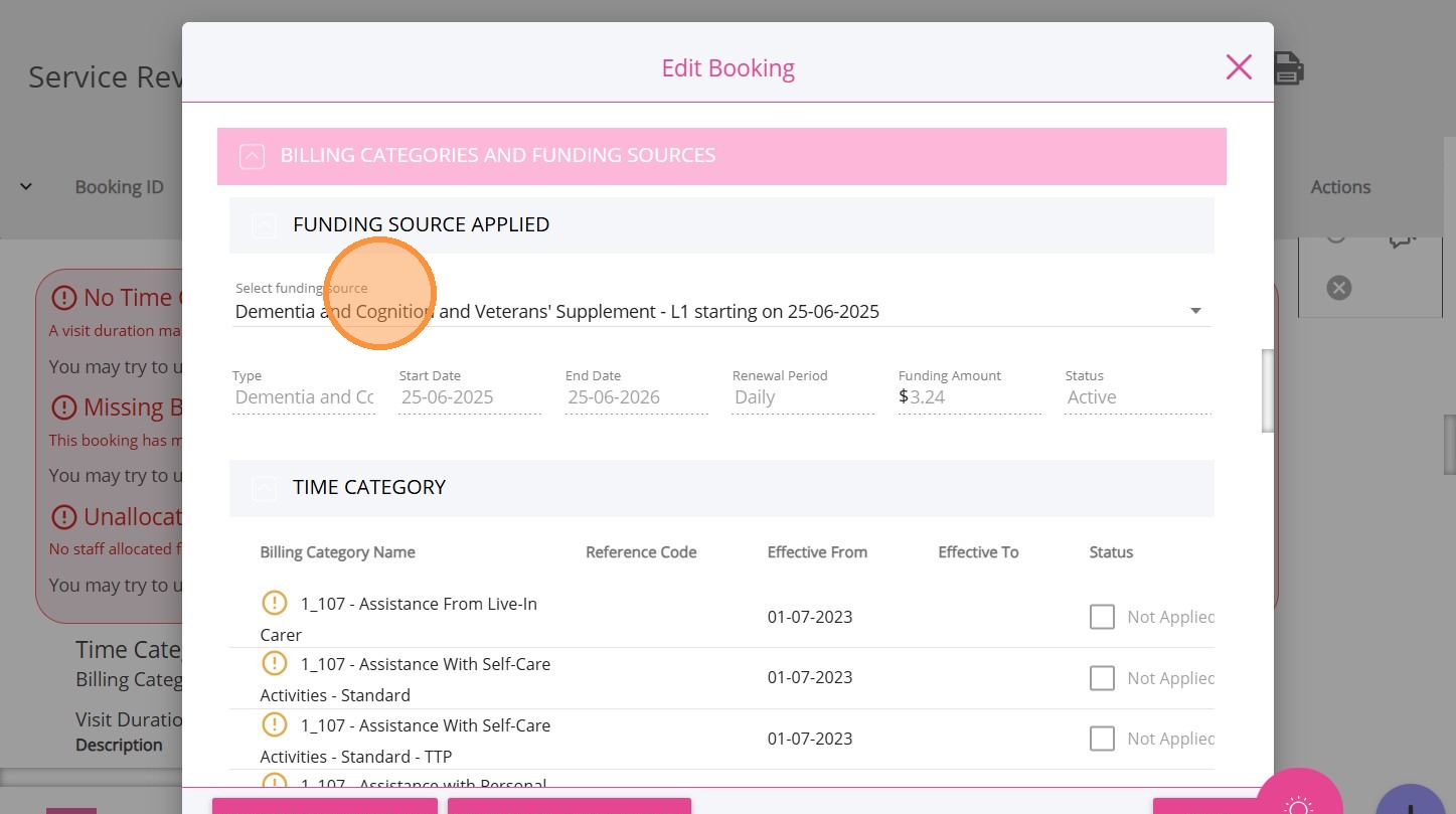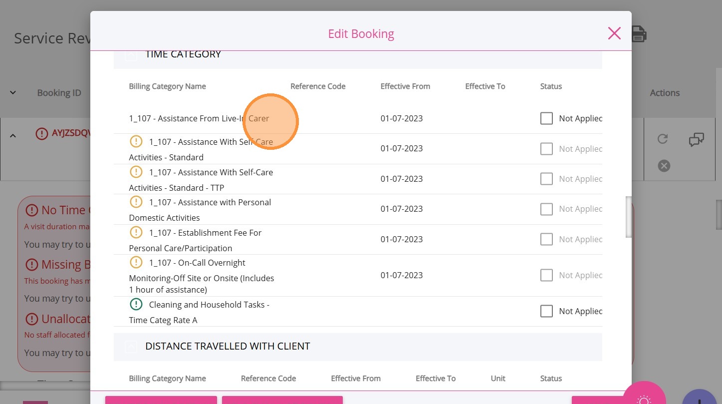 10. Then, return to the Service Review Board where you are editing the booking. You will see that the billing category Assistance from Live-In Carer no longer has an exclamation mark, indicating it is now included in the client’s funding source.