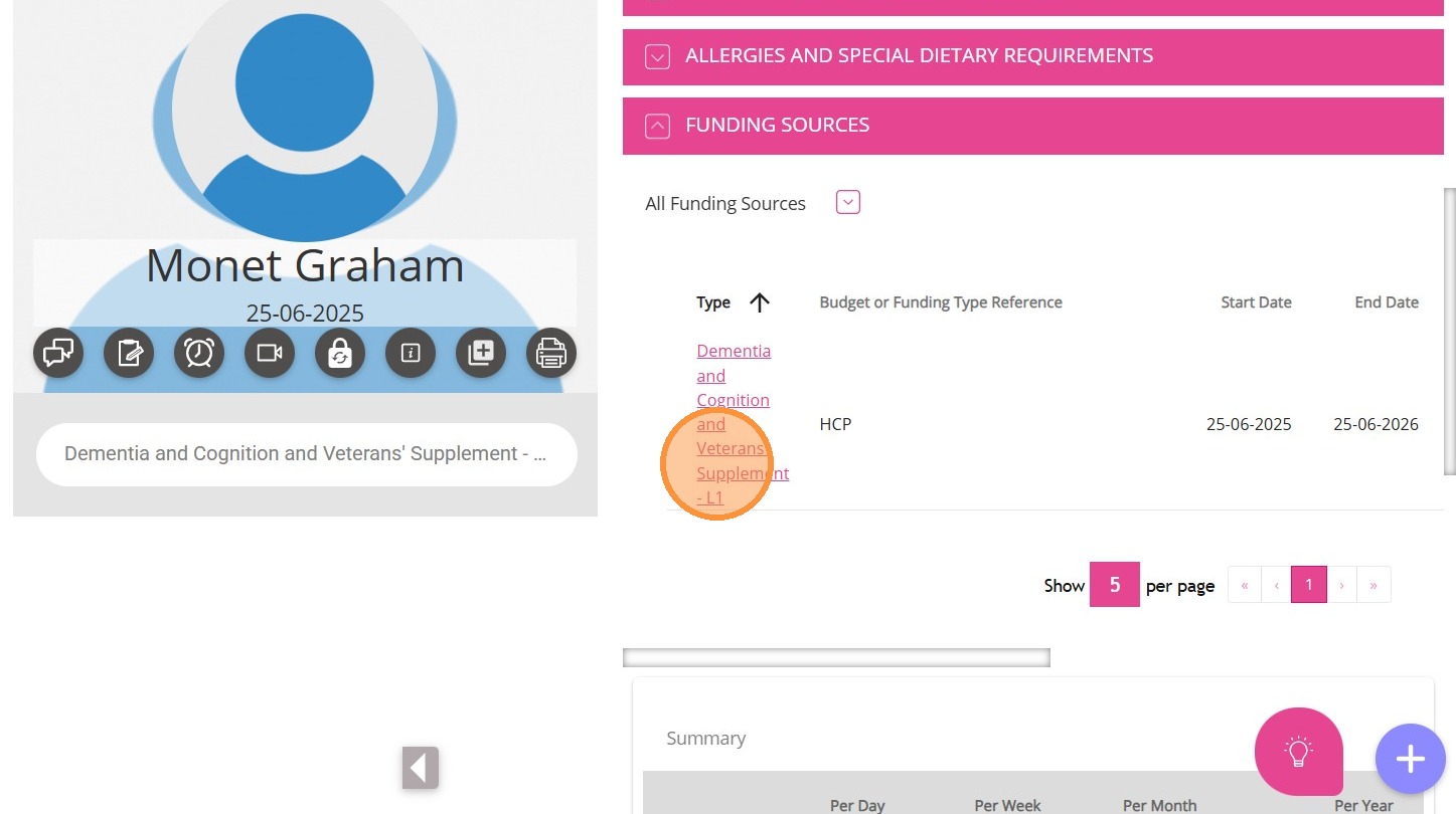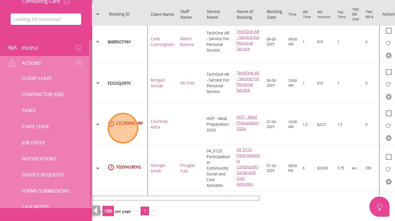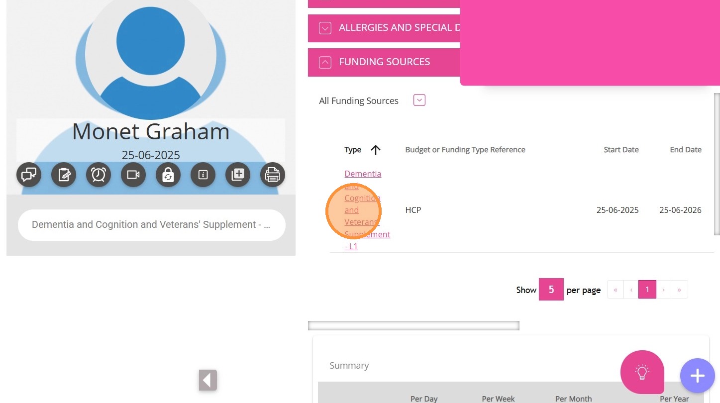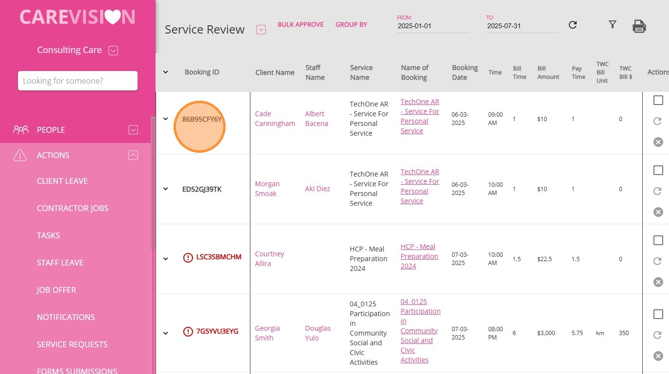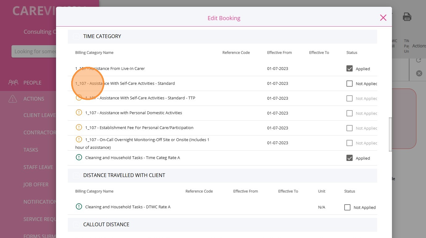 10. Then, return to the Service Review Board where you are editing the booking. You will see that the billing category Assistance from Live-In Carer no longer has an exclamation mark, indicating it is now included in the client’s funding source.