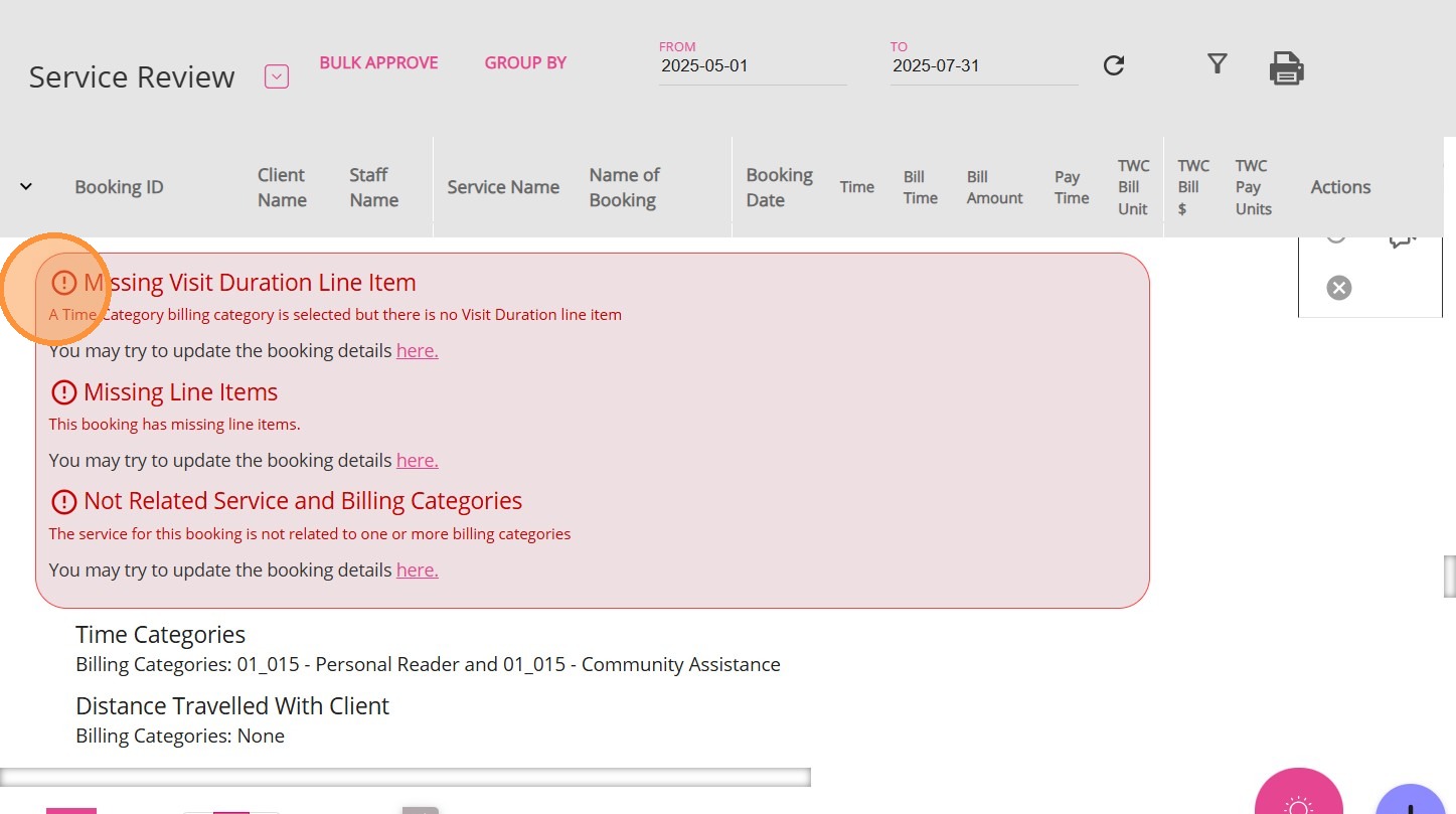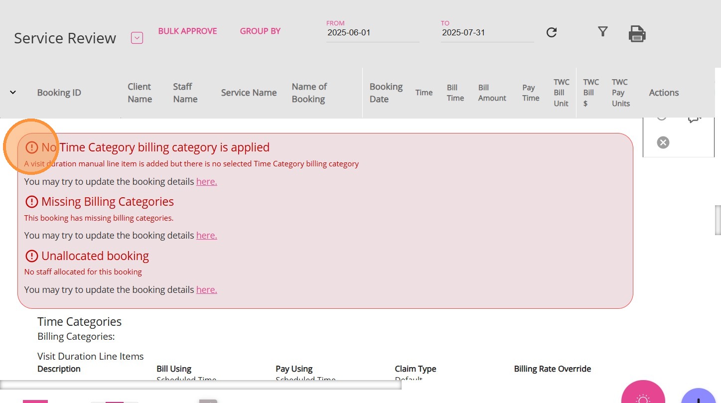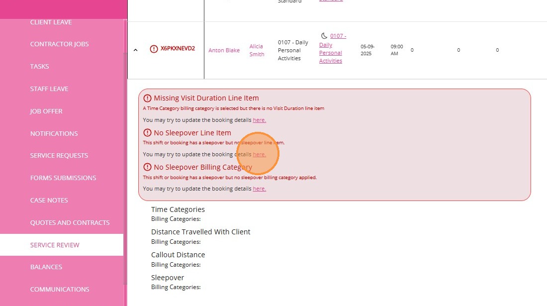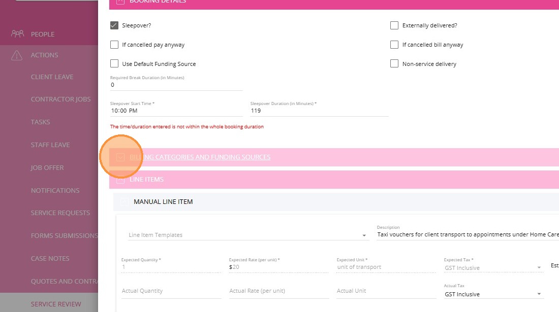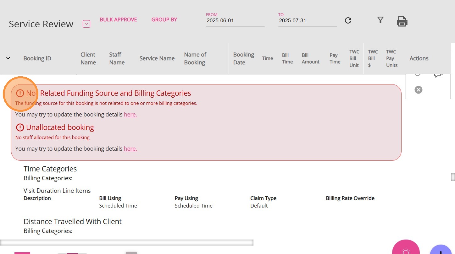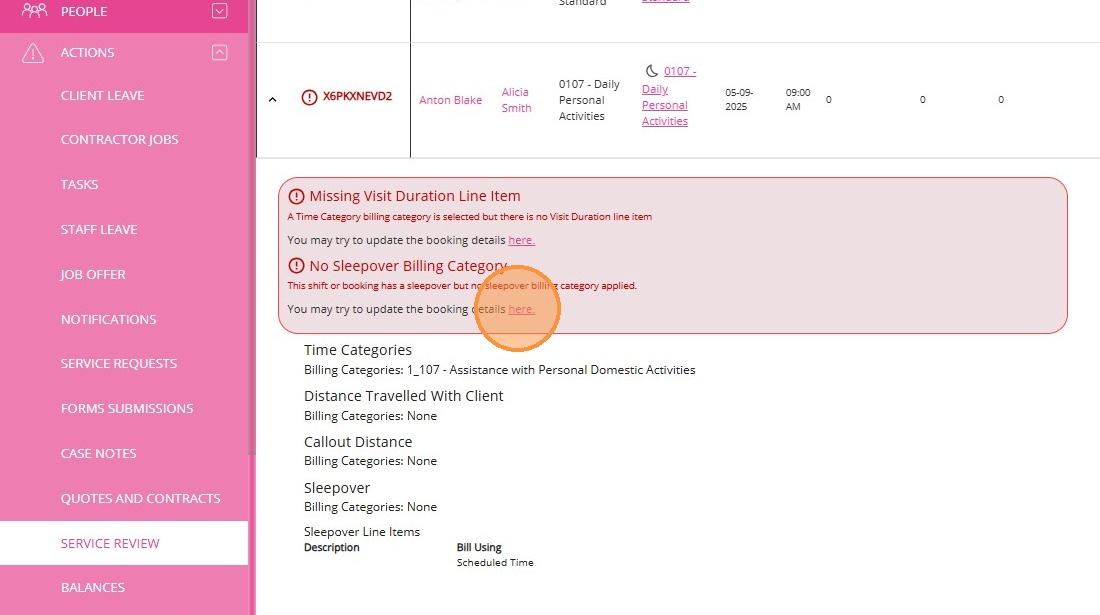 Keywords: service review board, booking warnings, missing line items, billing categories, funding source, sleepover issue, visit duration, archived categories, unallocated booking, social group error, resolving alerts