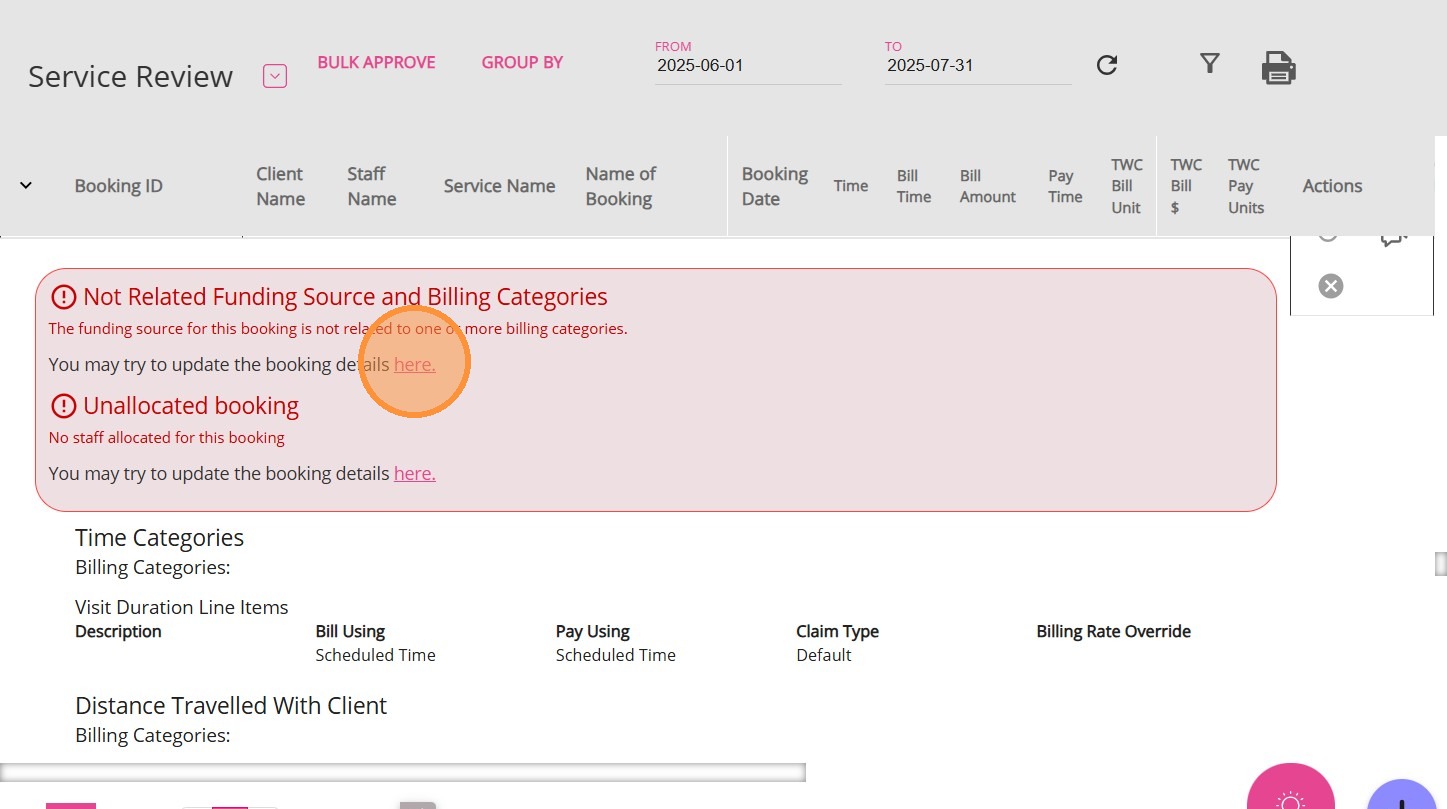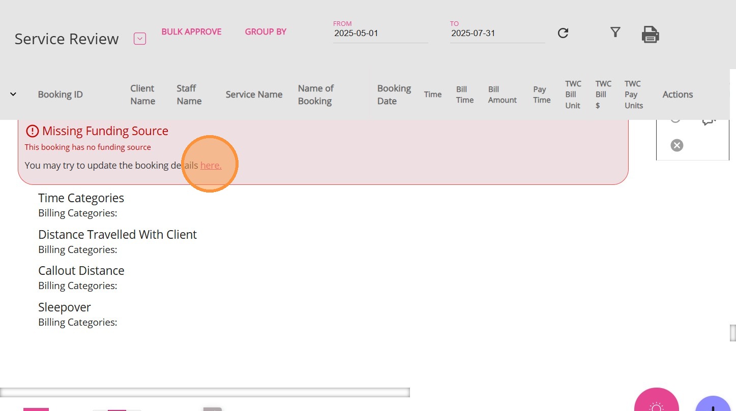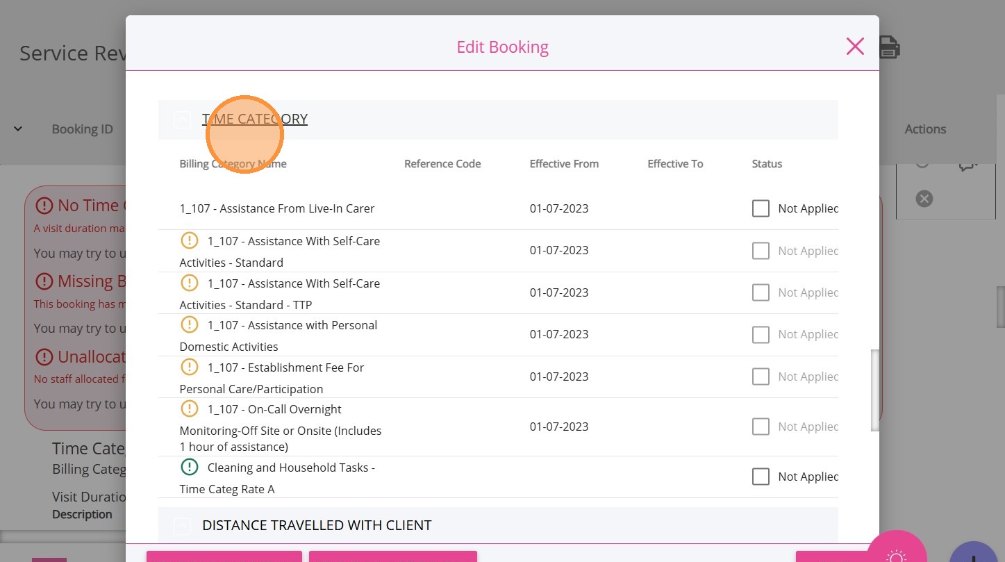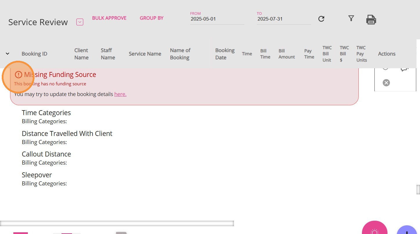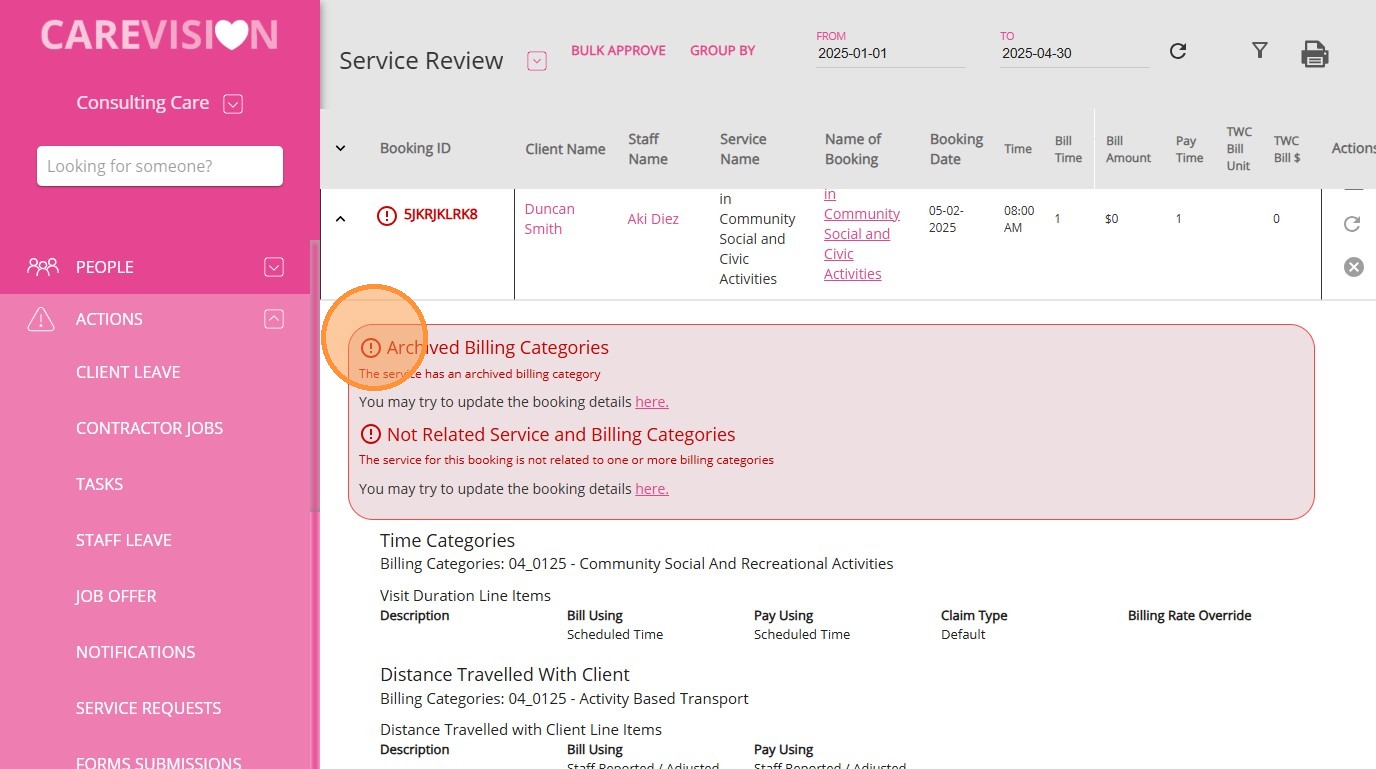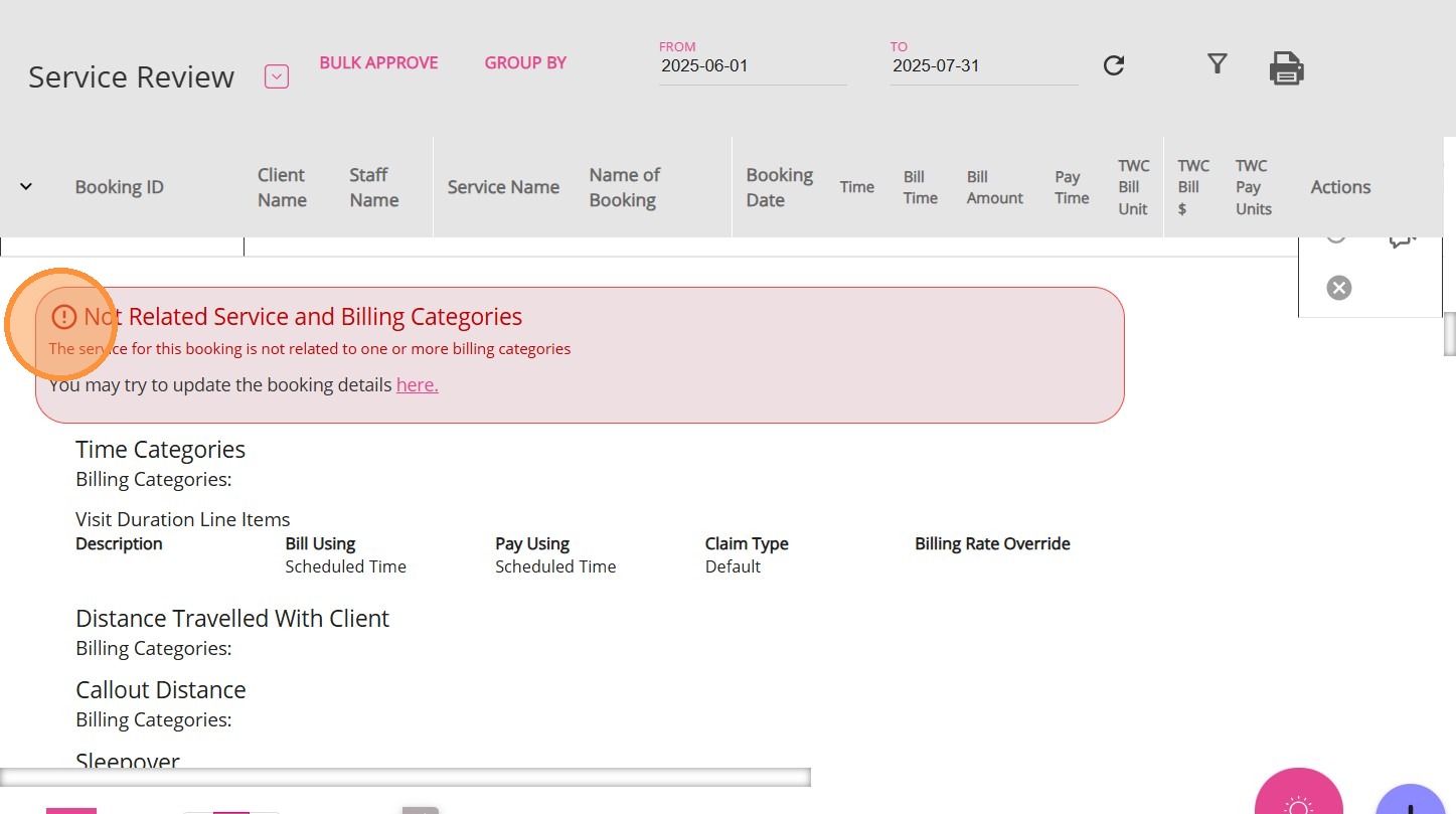 Keywords: service review board, booking warnings, missing line items, billing categories, funding source, sleepover issue, visit duration, archived categories, unallocated booking, social group error, resolving alerts