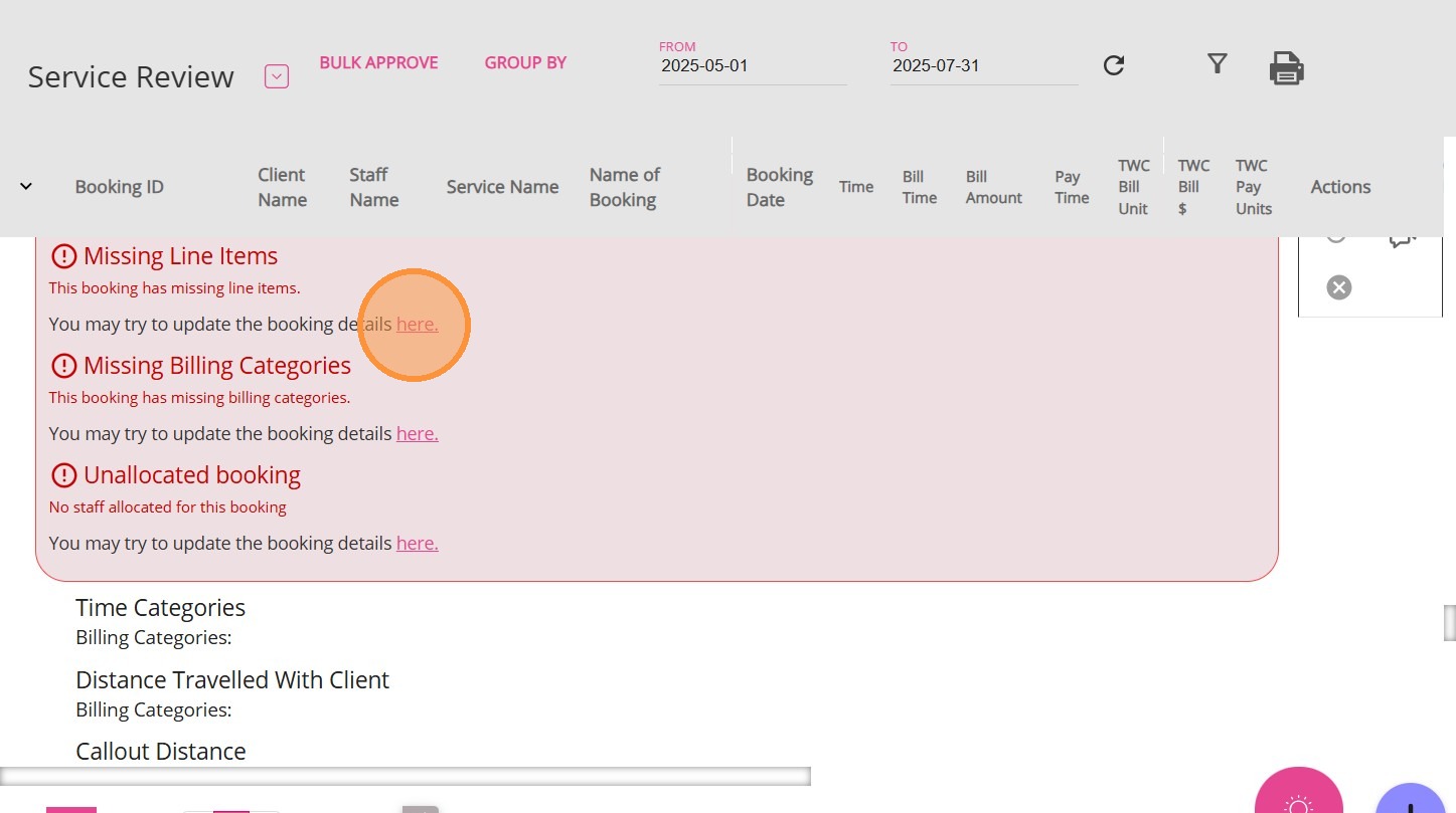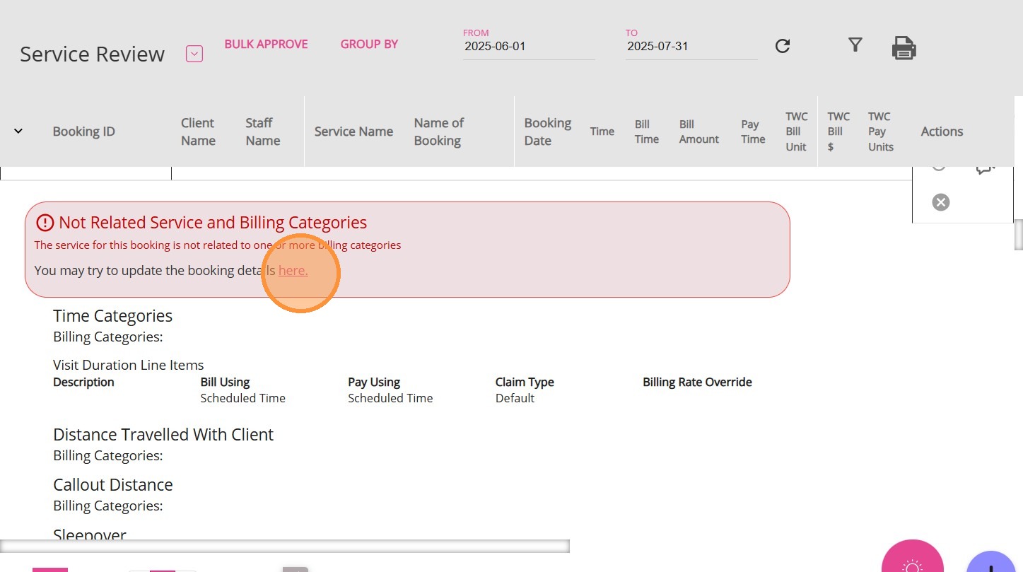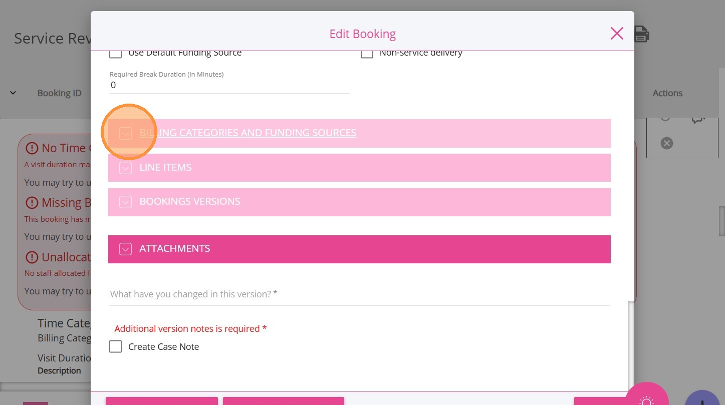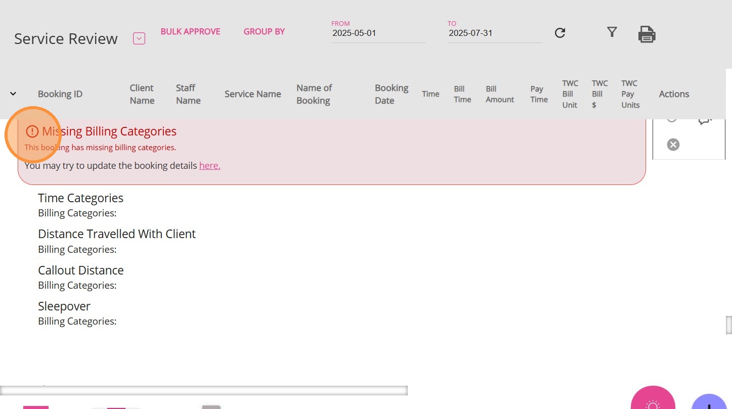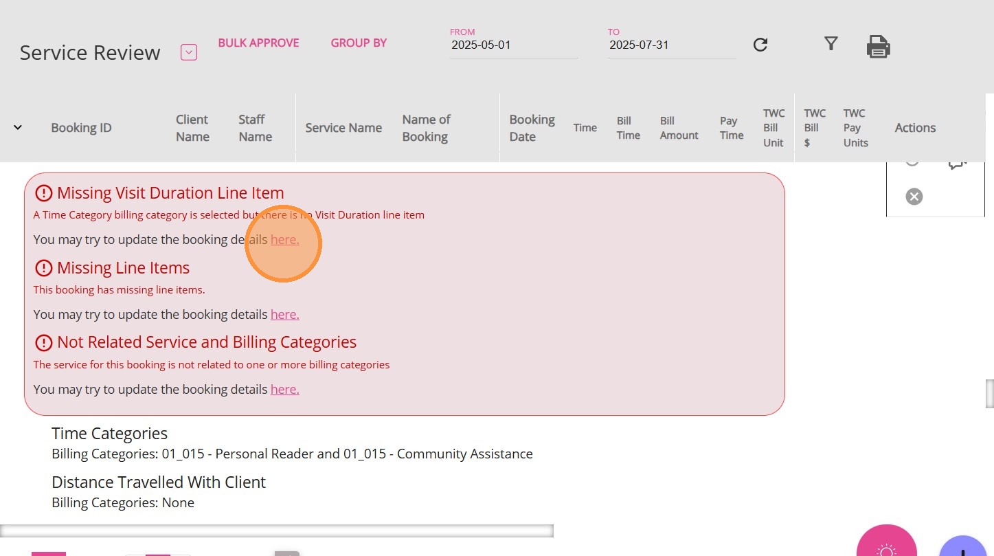 Keywords: service review board, booking warnings, missing line items, billing categories, funding source, sleepover issue, visit duration, archived categories, unallocated booking, social group error, resolving alerts