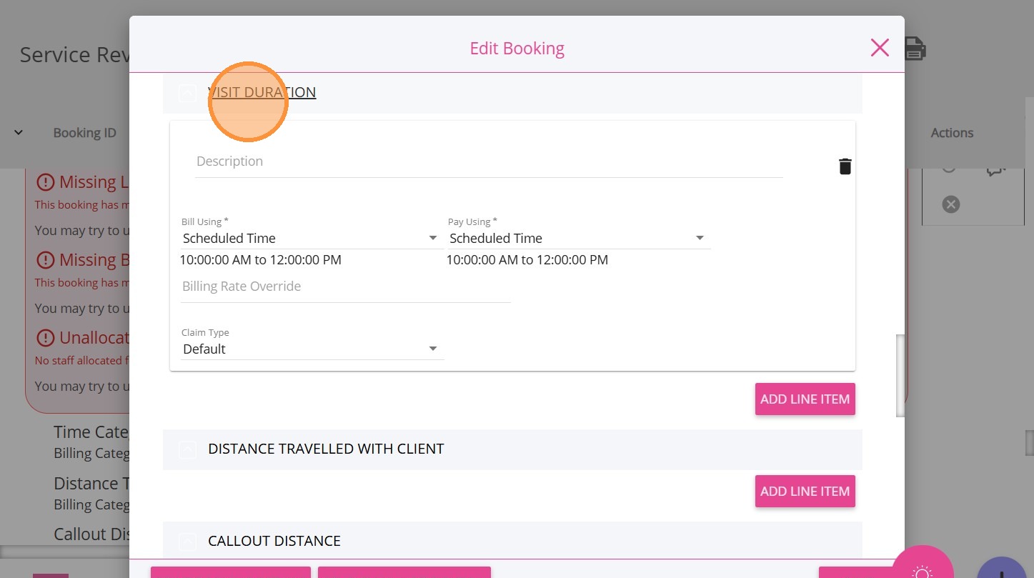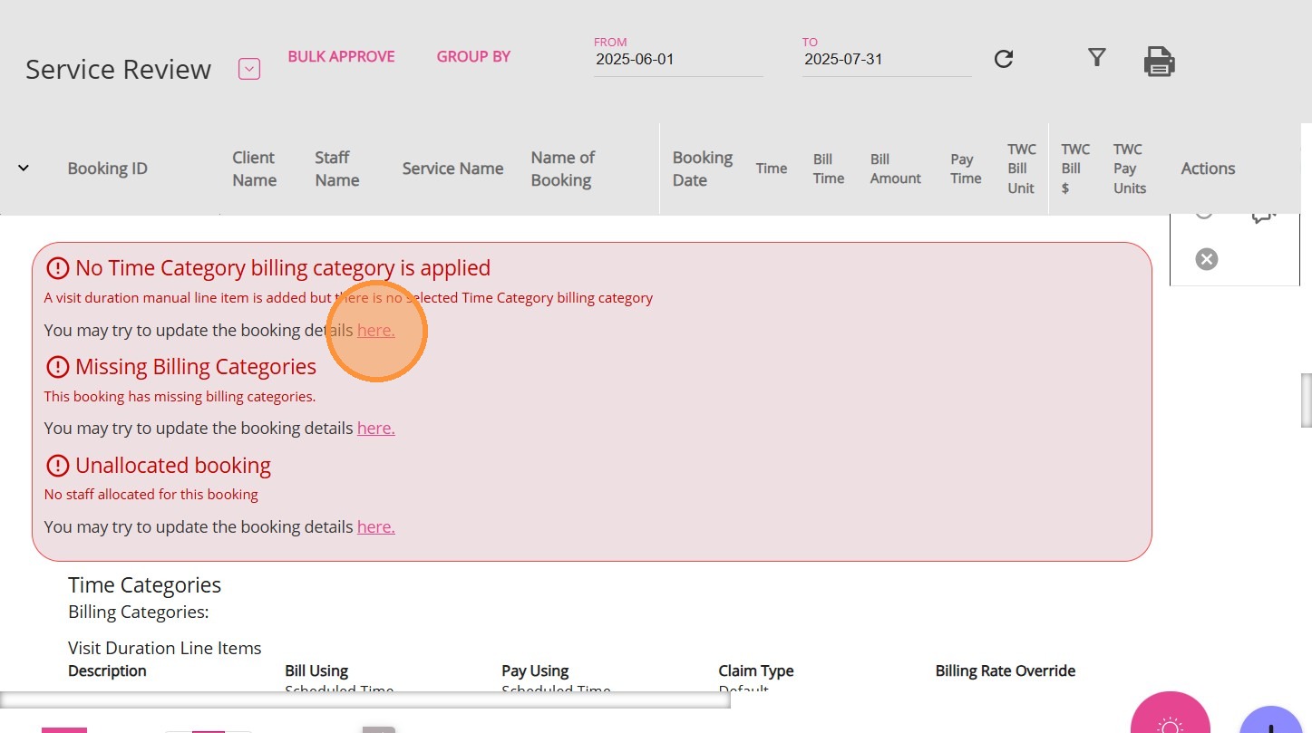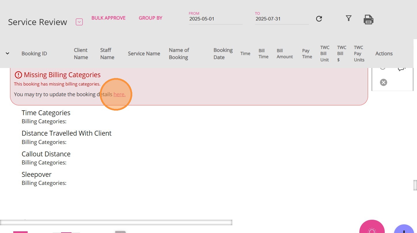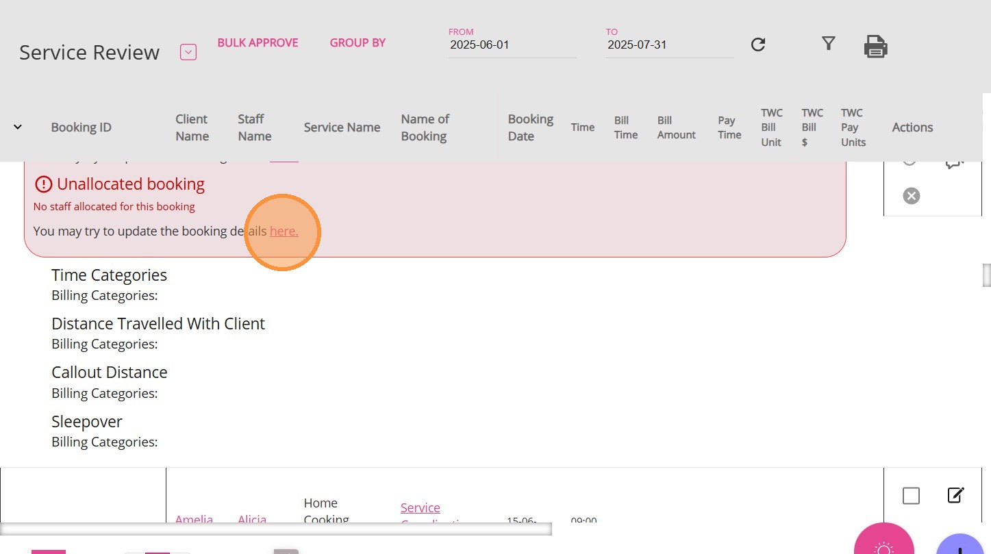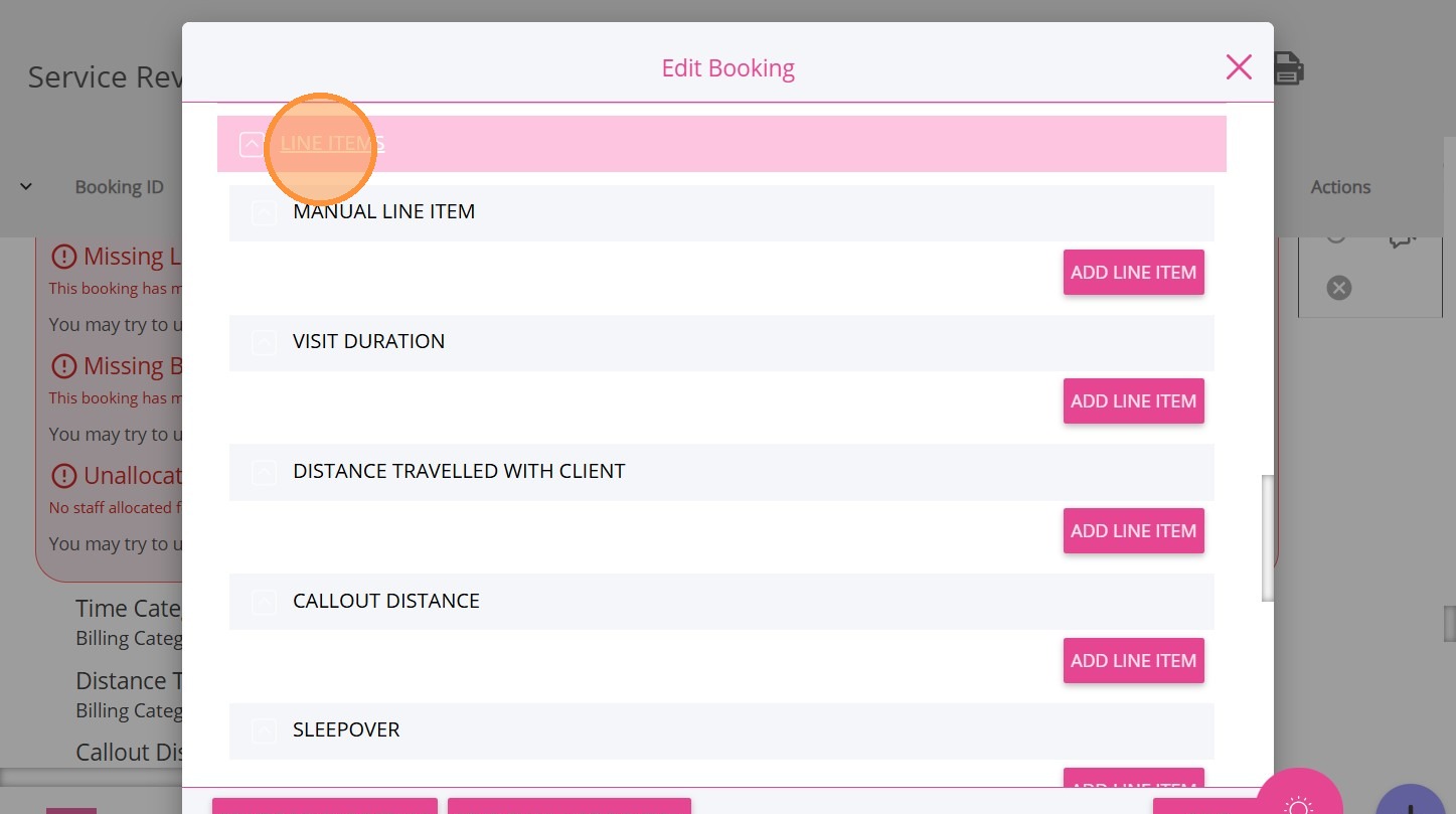 Keywords: service review board, booking warnings, missing line items, billing categories, funding source, sleepover issue, visit duration, archived categories, unallocated booking, social group error, resolving alerts