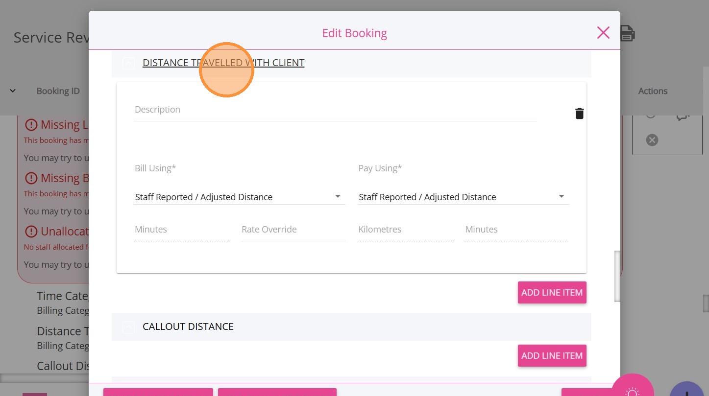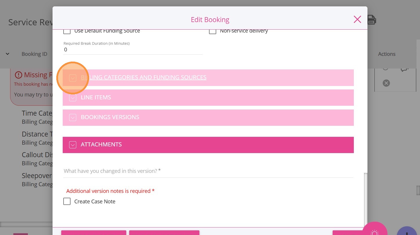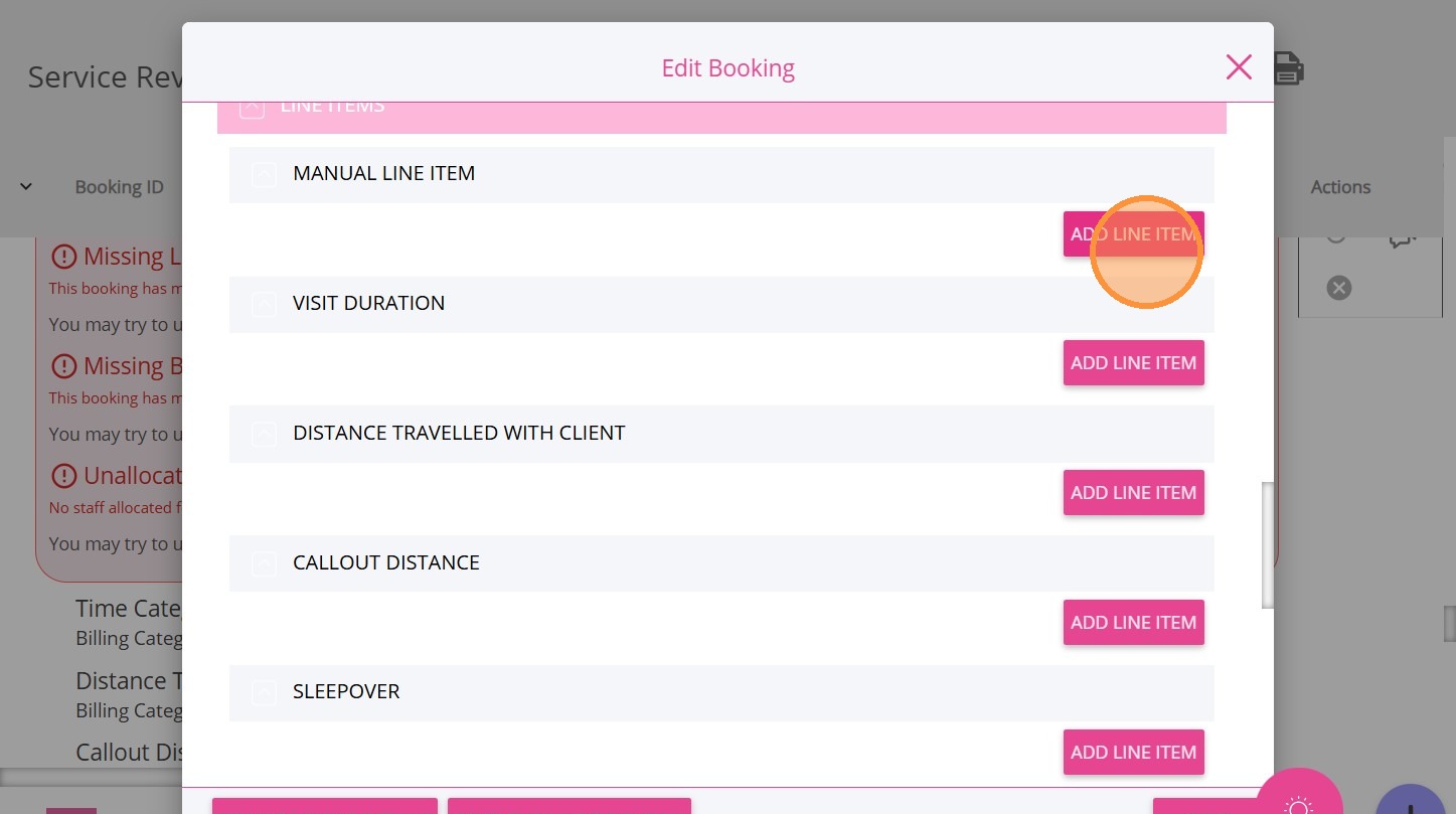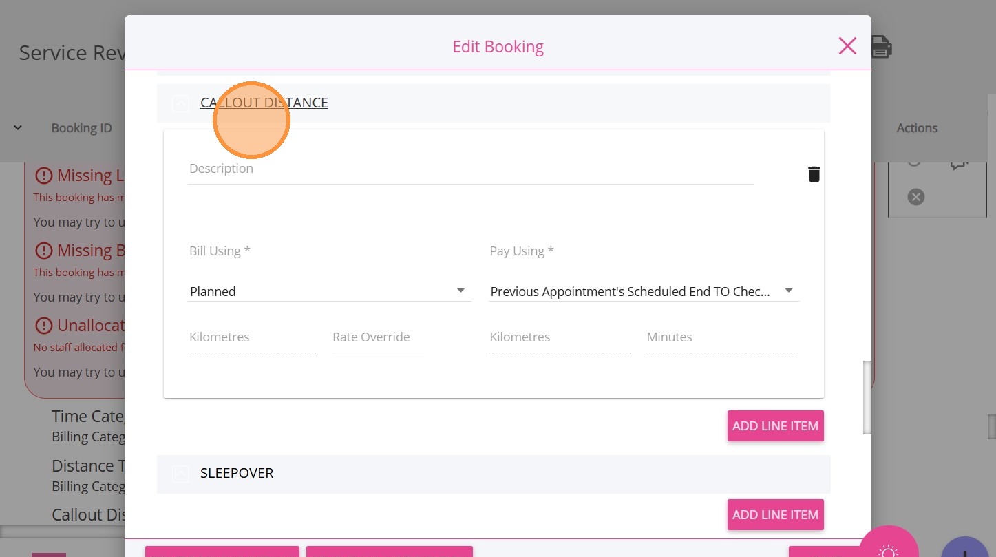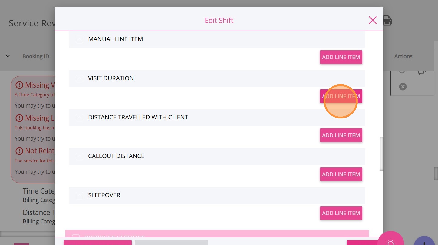 Keywords: service review board, booking warnings, missing line items, billing categories, funding source, sleepover issue, visit duration, archived categories, unallocated booking, social group error, resolving alerts