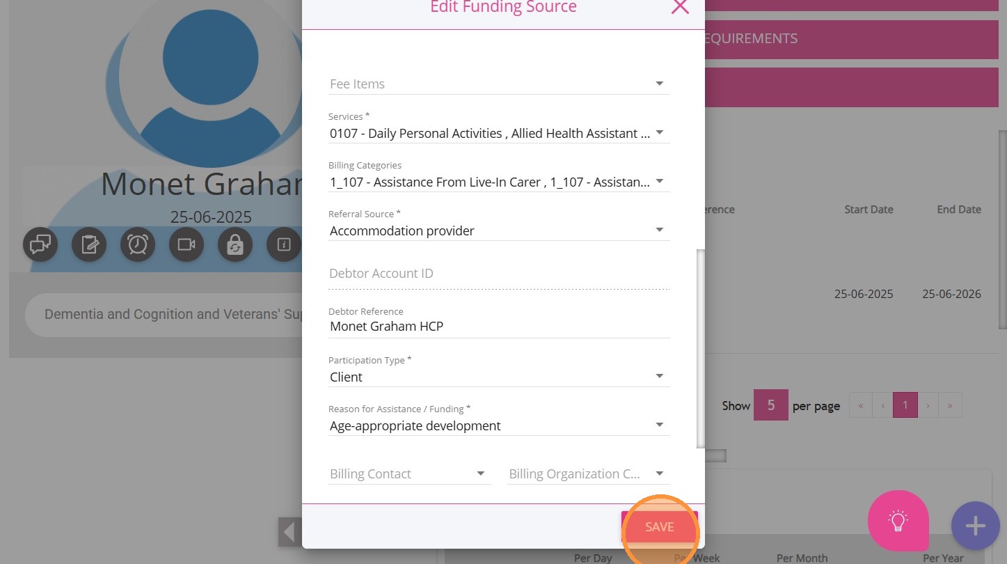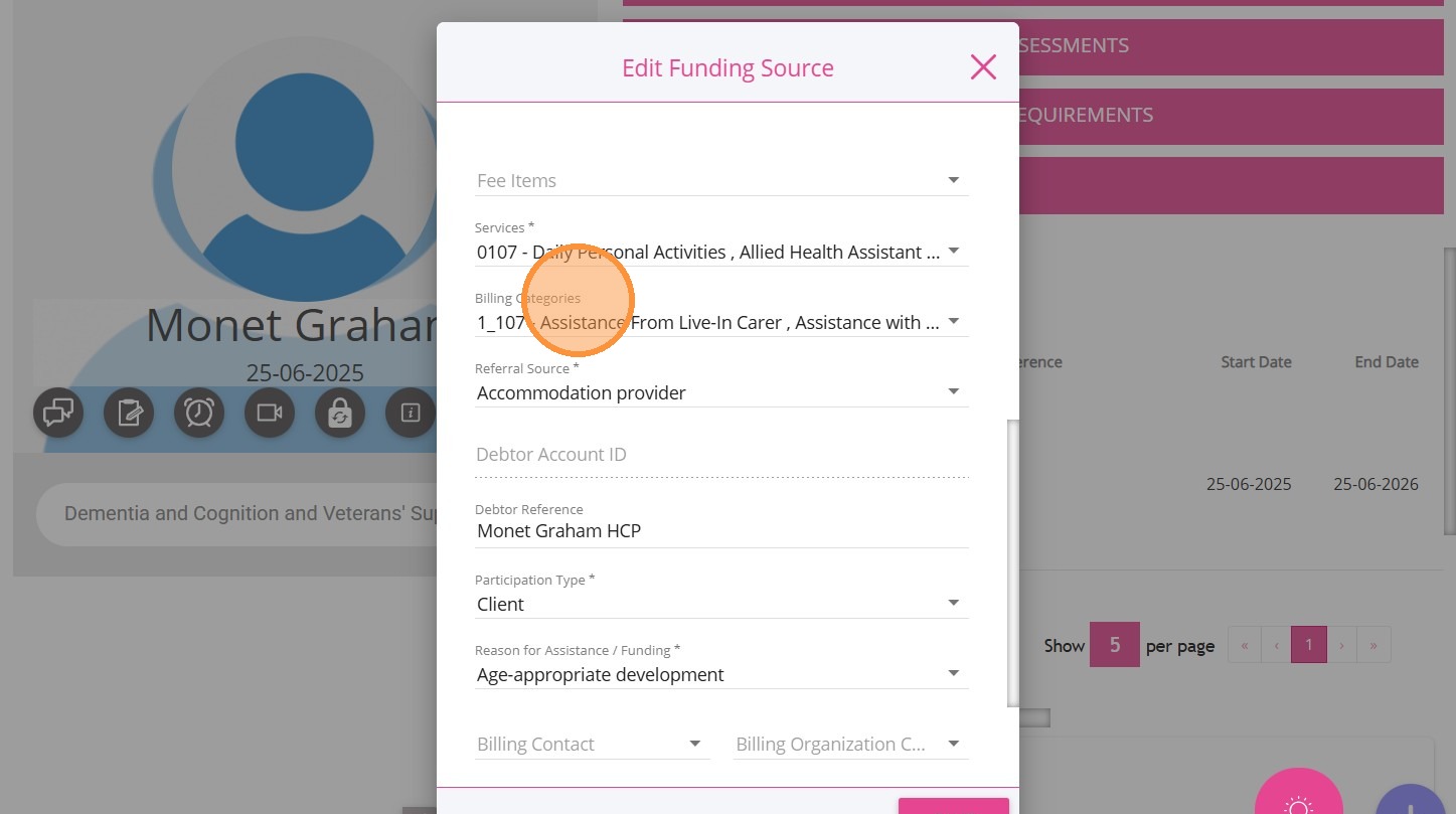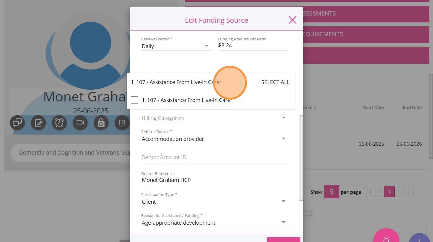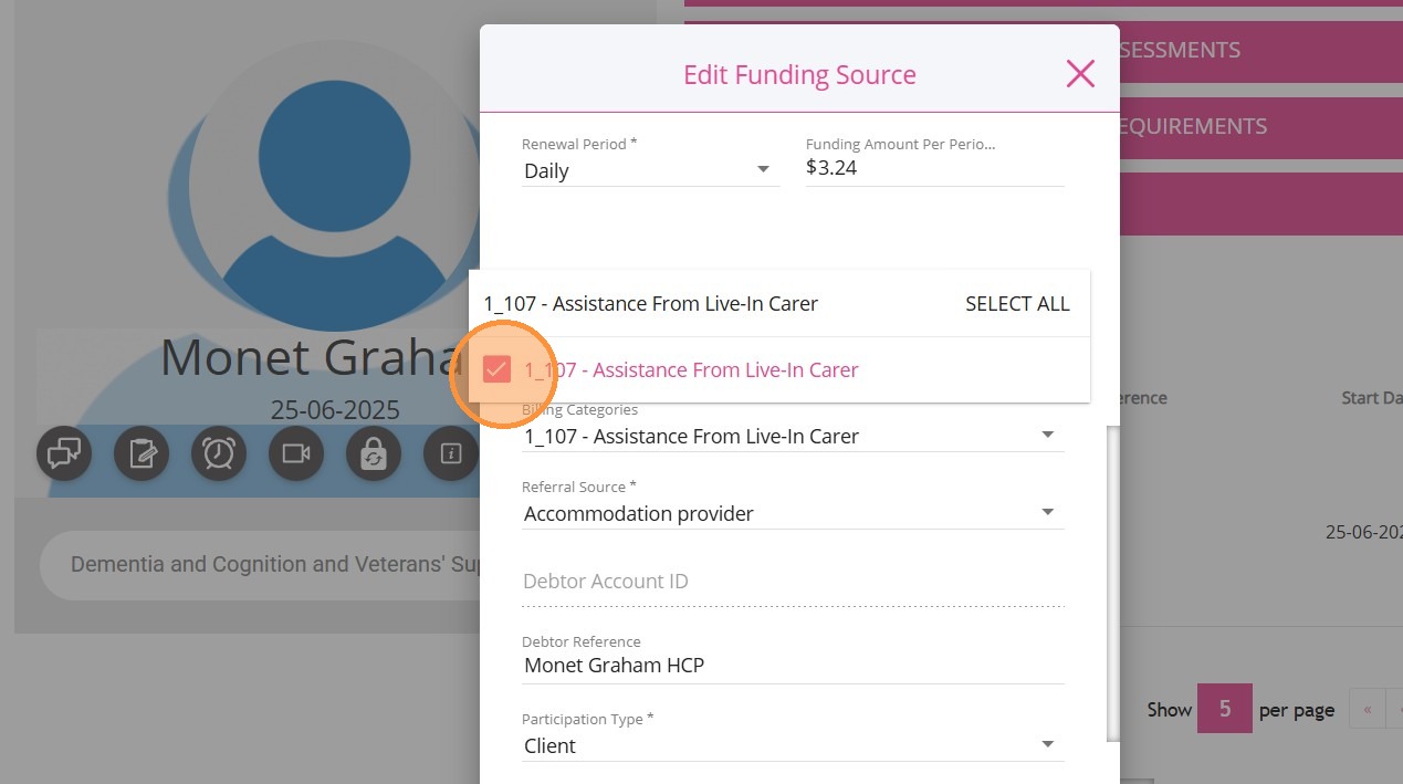 9. Check the flagged billing category Assistance from Live-In Carer to include it in the current funding source. Then, click Save.