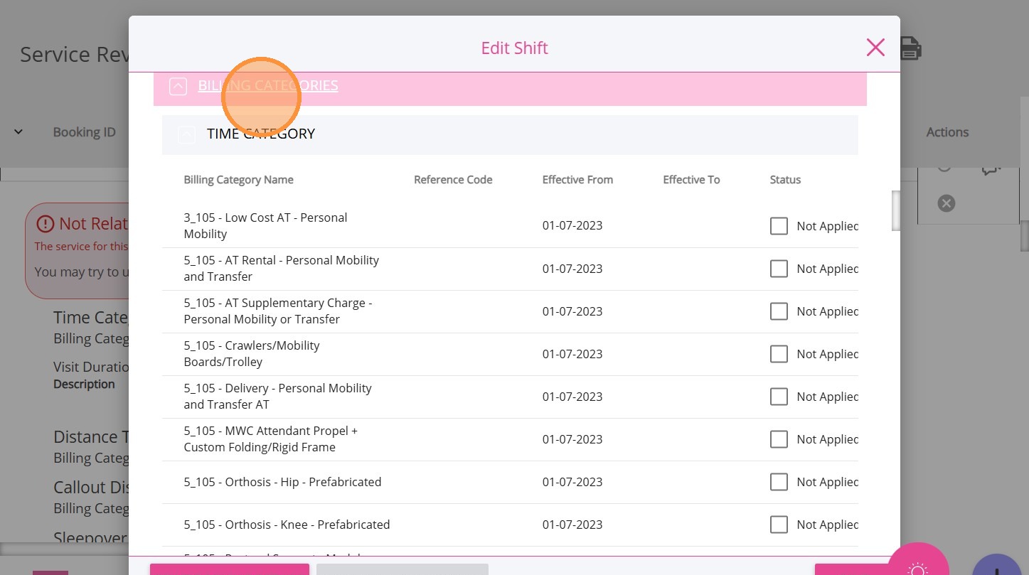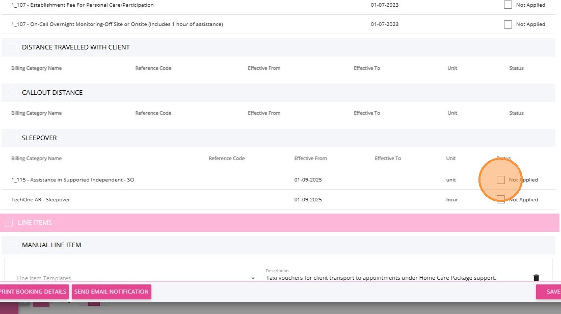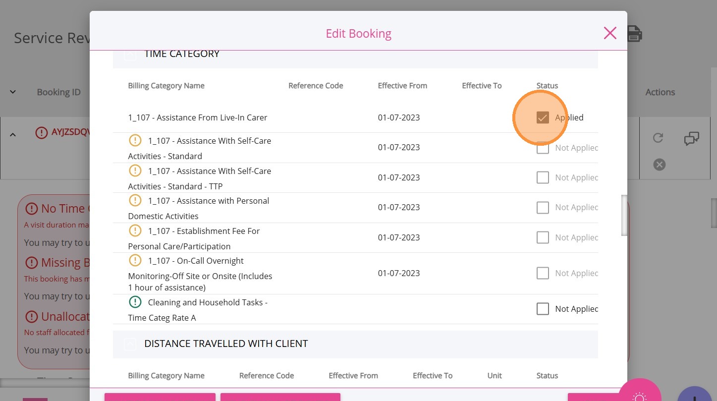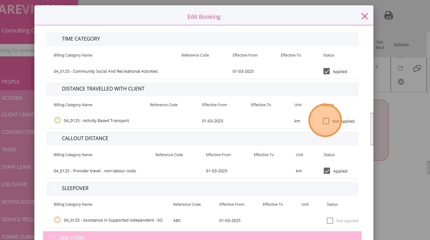 4. Under the Status column, check the box if you determine it is appropriate to apply the billing category to the client’s booking. Use your discretion and ensure the selection is accurate.