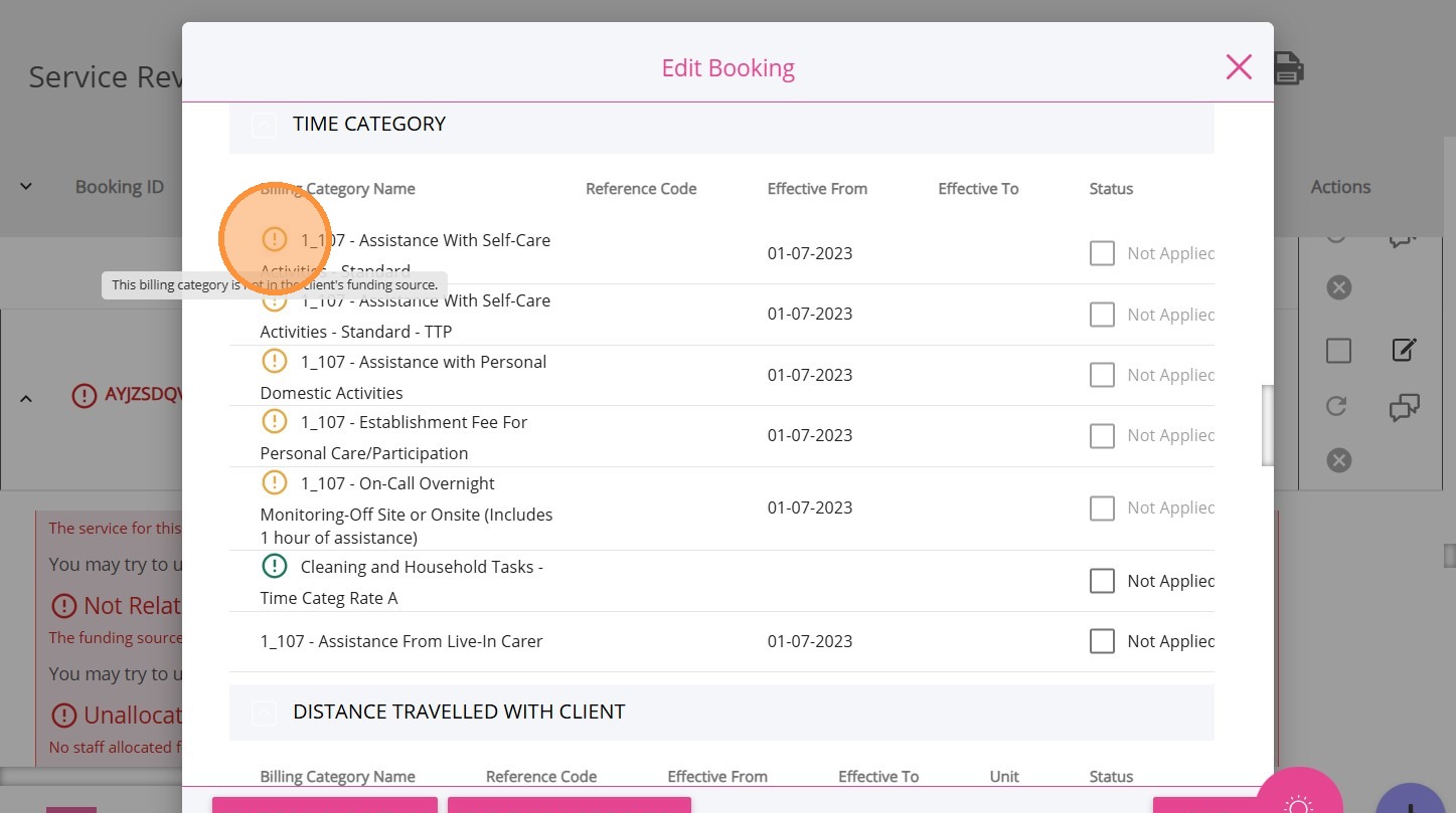 4. An exclamation mark indicates that the billing category is not available under the client’s current funding source. For example, the billing category Assistance with Self-Care Activities - Standard may appear in the client’s booking, but it is not covered by their current funding source.