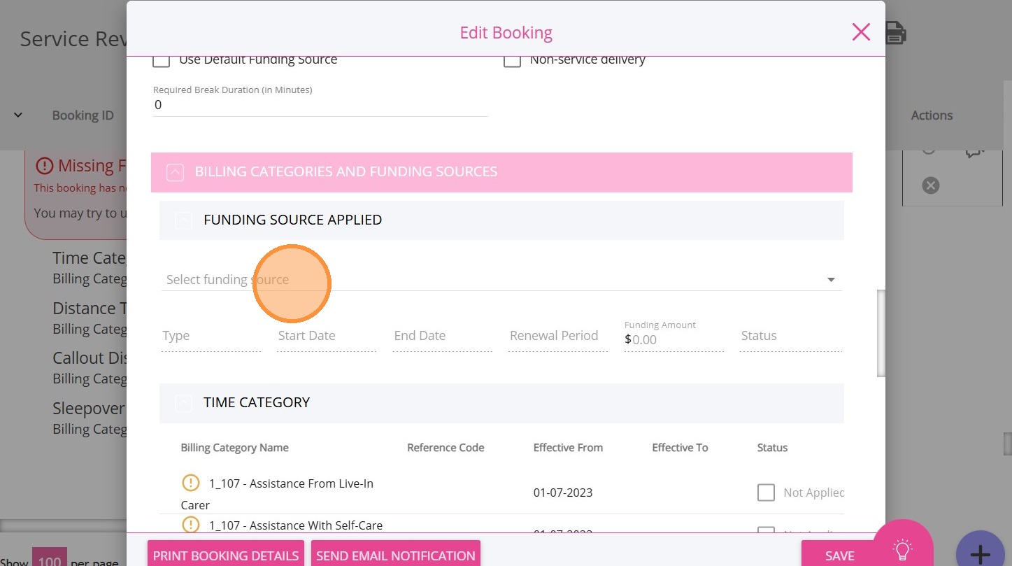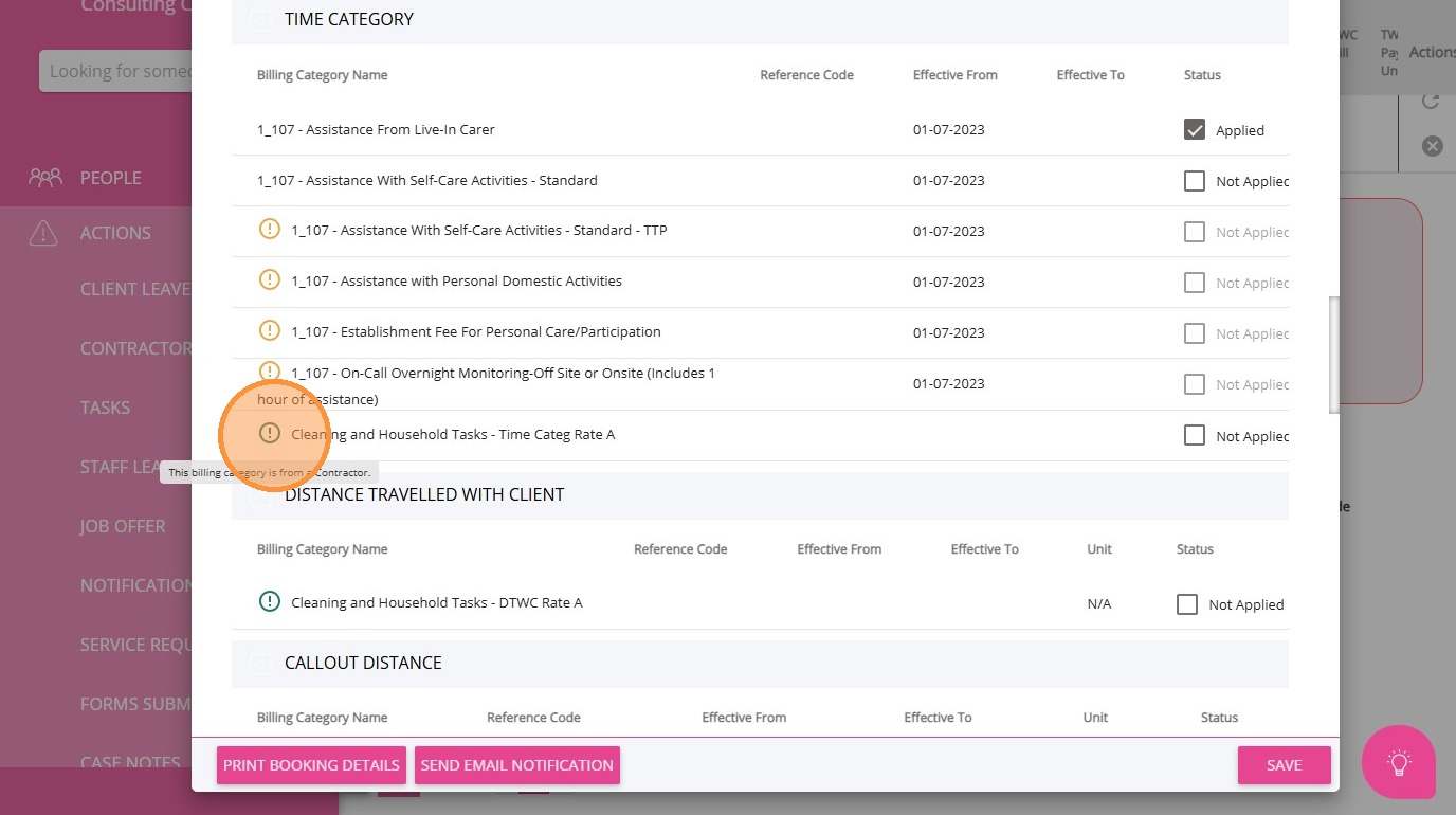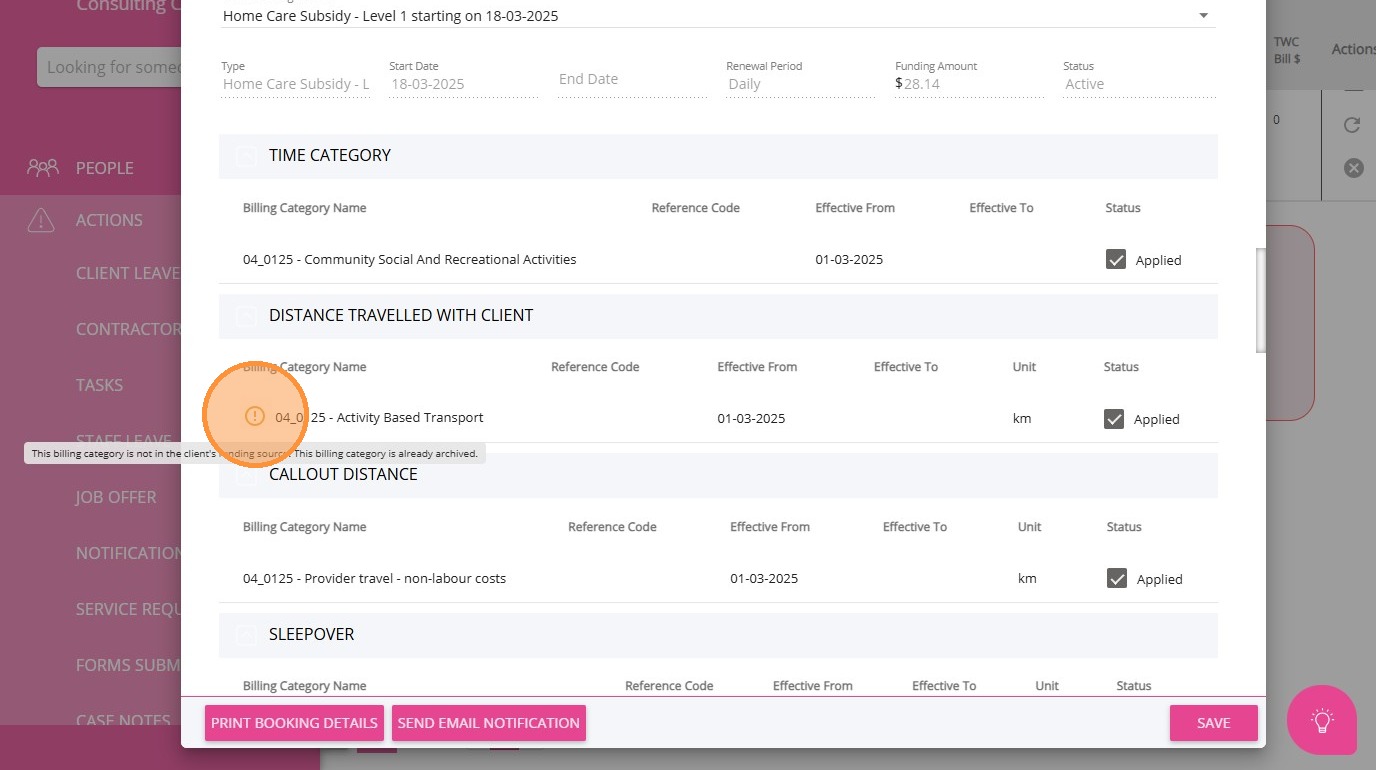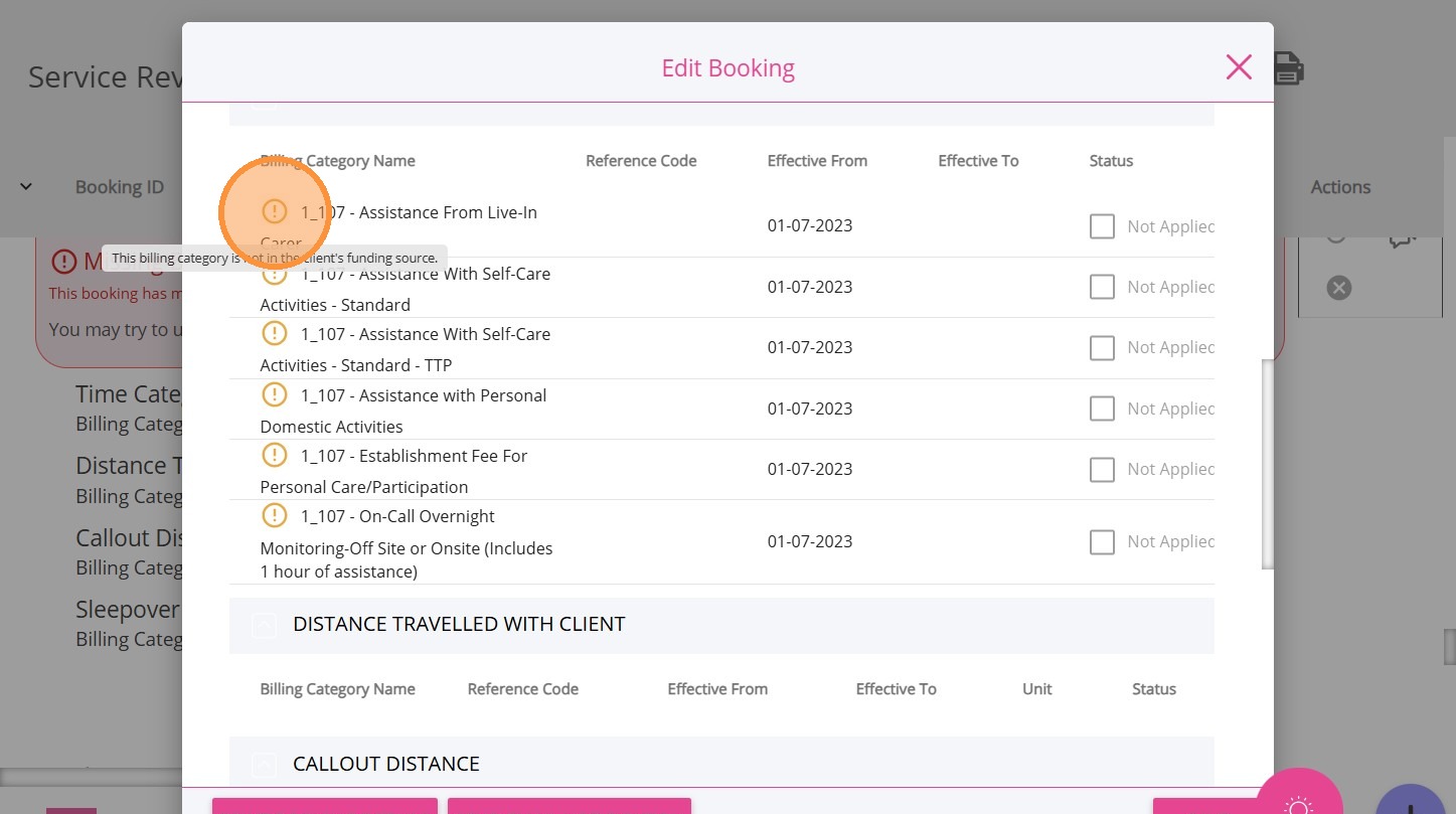 4. Scroll down to each flagged billing category. An exclamation mark indicates that the billing category is not available under the client’s current funding source. For example, the billing category Assistance from Live-In Carer may appear in the client’s booking, but it is not covered by their current funding source.