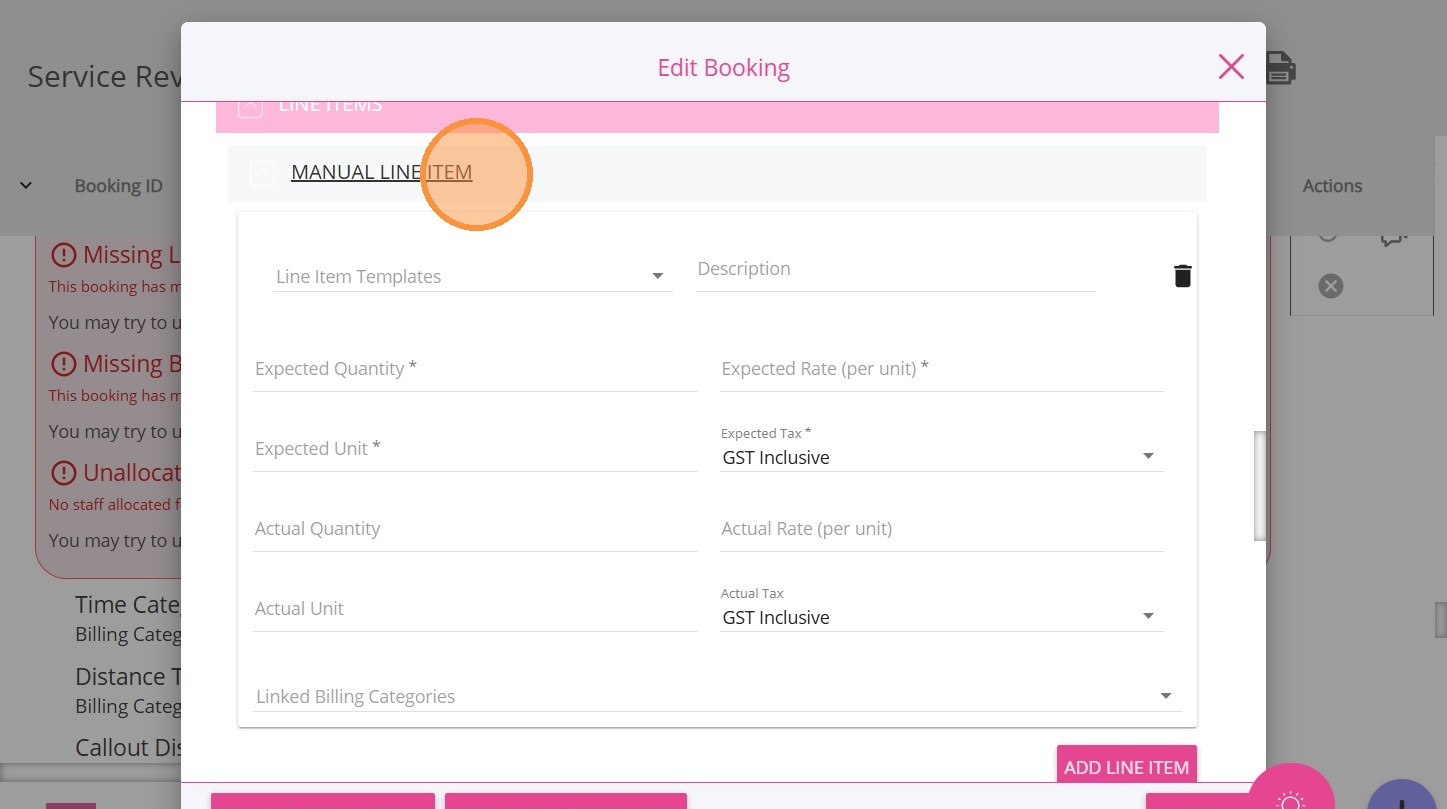 Staff forgot to log kilometers (KMs) and called into office | Service Review board and booking line items for missing KM entries. | Edit the booking to add the reported KMs as a custom line item, then save and document the correction. |