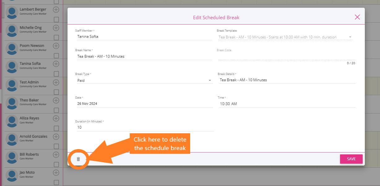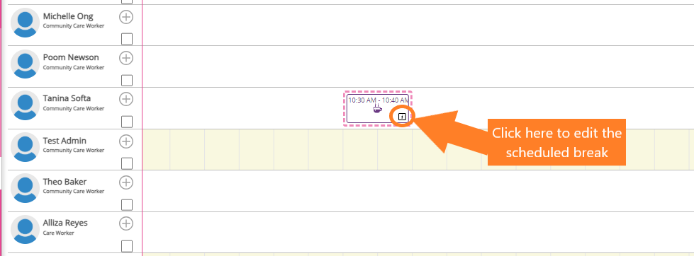 If you need to delete a break you can do so by clicking the coffee icon to open the break detail and then selecting to delete