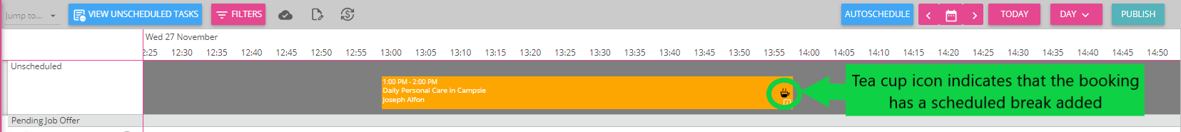 You can identify a booking on the scheduling area which will allow for a paid break as it shows a coffee cup icon on the booking as well.