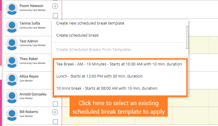 You may have multiple templates for the same Break Name i.e. Morning Tea Break vs Midday Tea Break vs Afternoon Tea Break vs Sleepover Tea Break, which can all be the 'Tea Break' as per your award but they can be set up with different default times or conditions to make it easier for your team to add them to the schedule.Add and Update Scheduled Breaks: