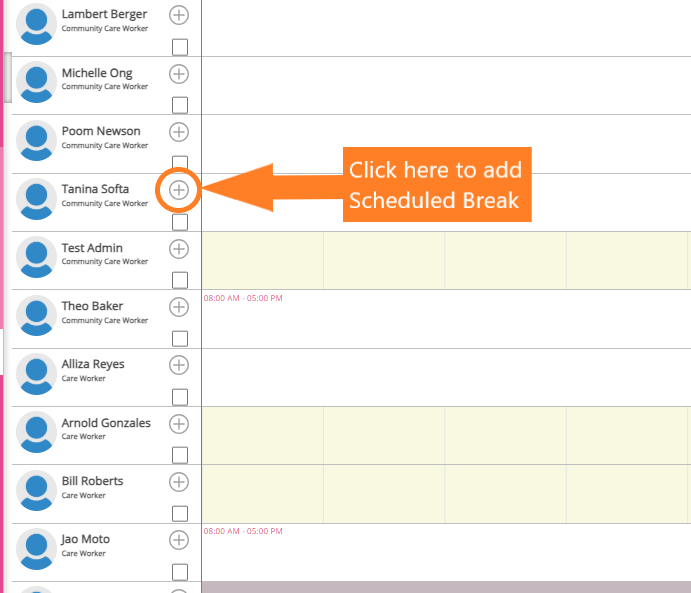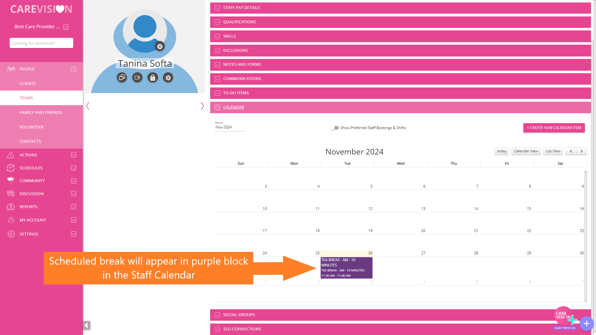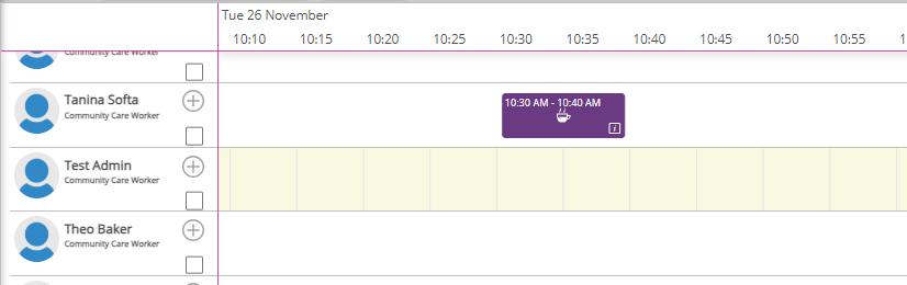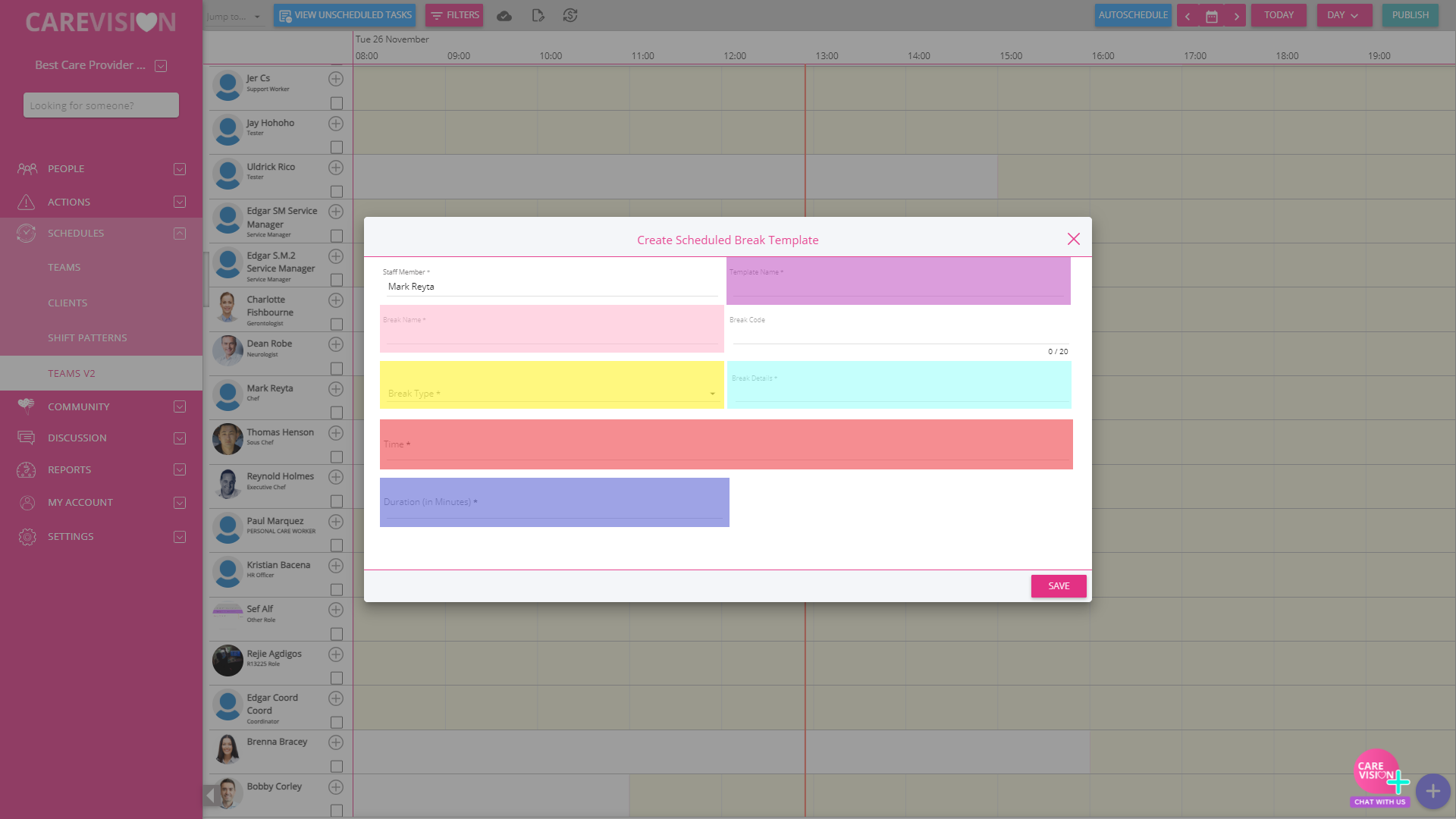 Care Vision functionality enables clear visibility on breaks assigned to staff during their workday, importantly these are scheduled as separate breaks, so they are not combined with shifts or travel time allocations. These breaks are tailored to your organisational needs and can easily be added/updated within the staff schedule.