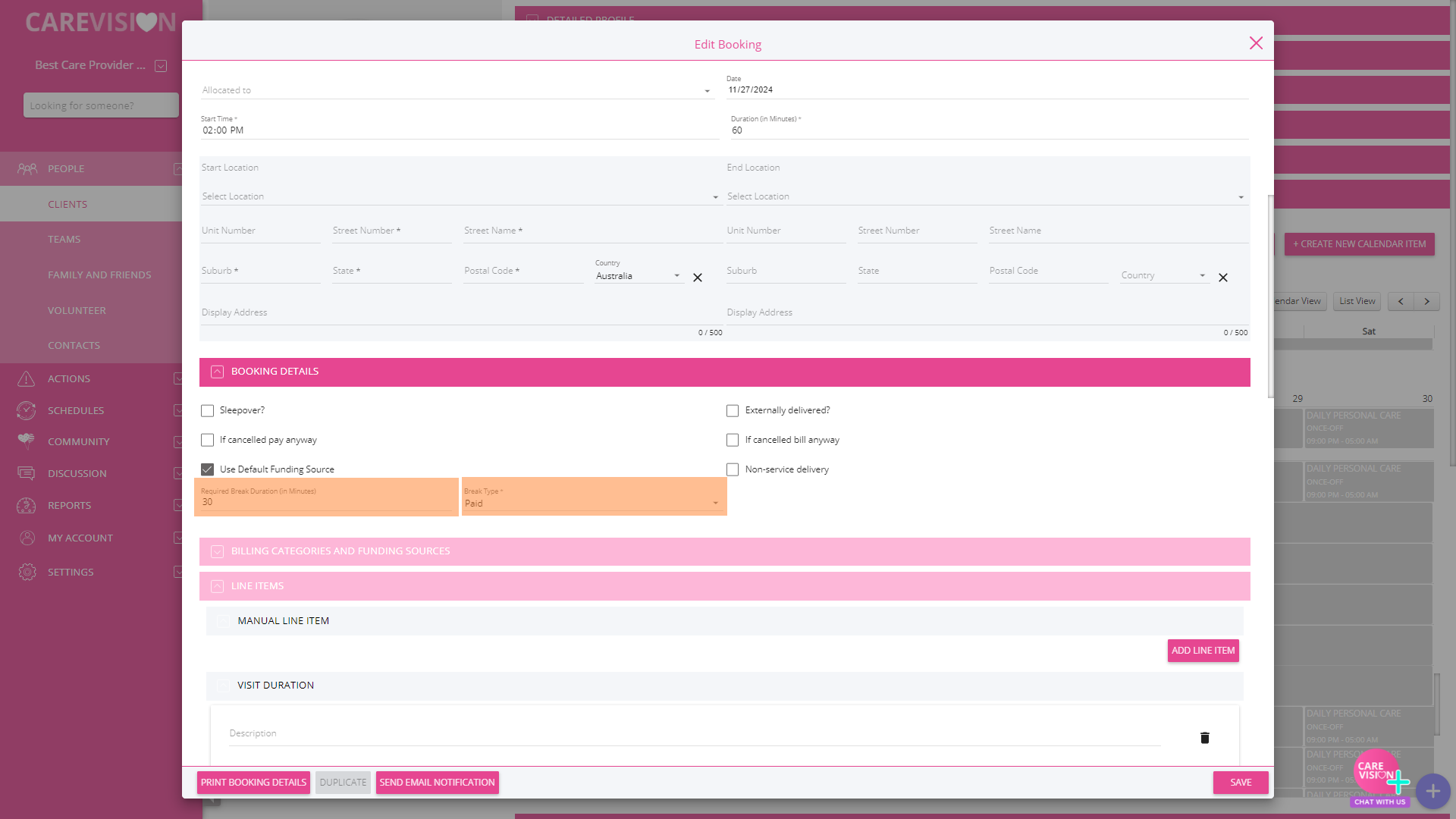 From time-to-time breaks must or can be taken with a client. We have included the ability to indicate this on the client care plan items, as well as on Ad Hoc Bookings, this will allow your scheduling team to see bookings where the client has accepted that a staff member can or needs to take a break during their booking. This can help scheduling teams optimize the cost of the roster by placing paid breaks overlapping with the bookings that allow for the paid breaks.