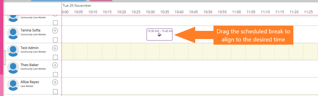 Once the break is in view on the schedule you can move the break around on the day to the most suitable time.