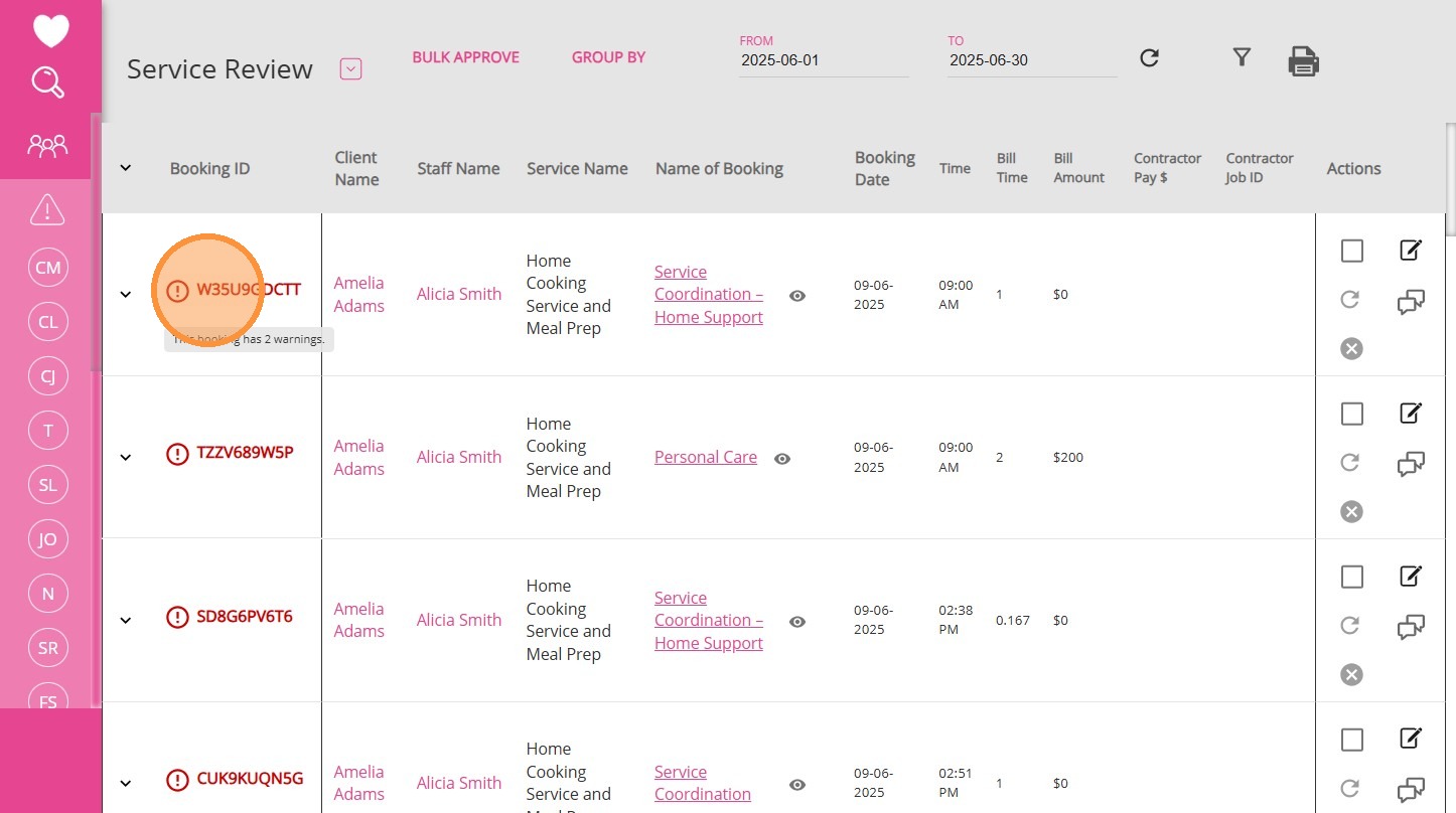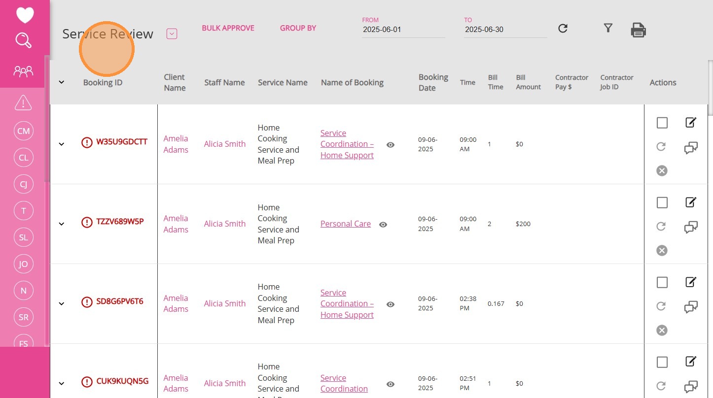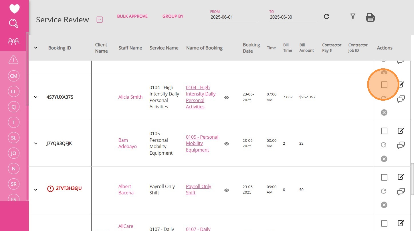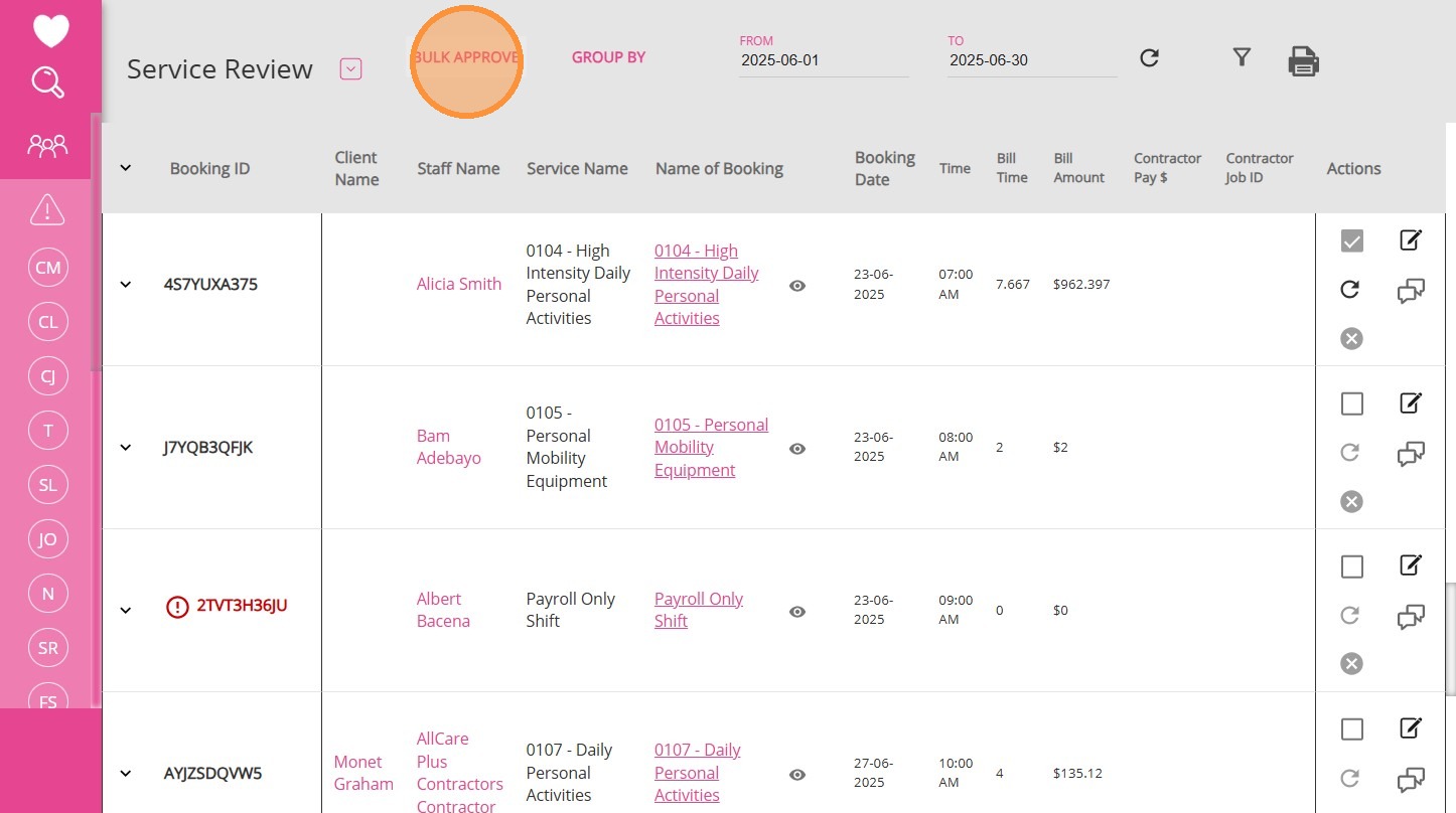 The Service Review Board is a tool that displays all your service bookings within a selected timeframe. It helps teams review, validate, and approve bookings before moving forward with billing and claiming. By default, it shows only items that are not yet approved, so you can quickly identify bookings needing attention.