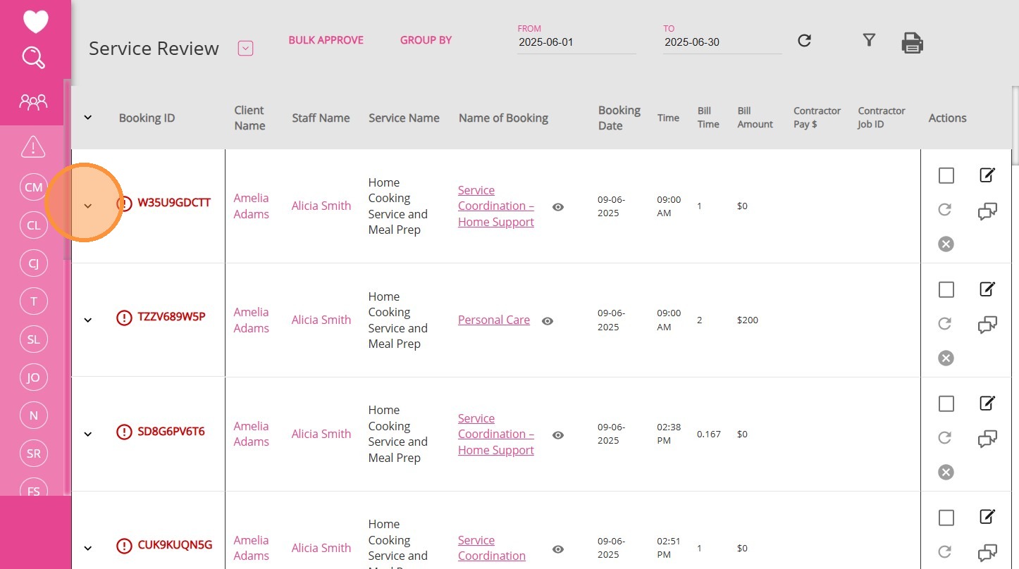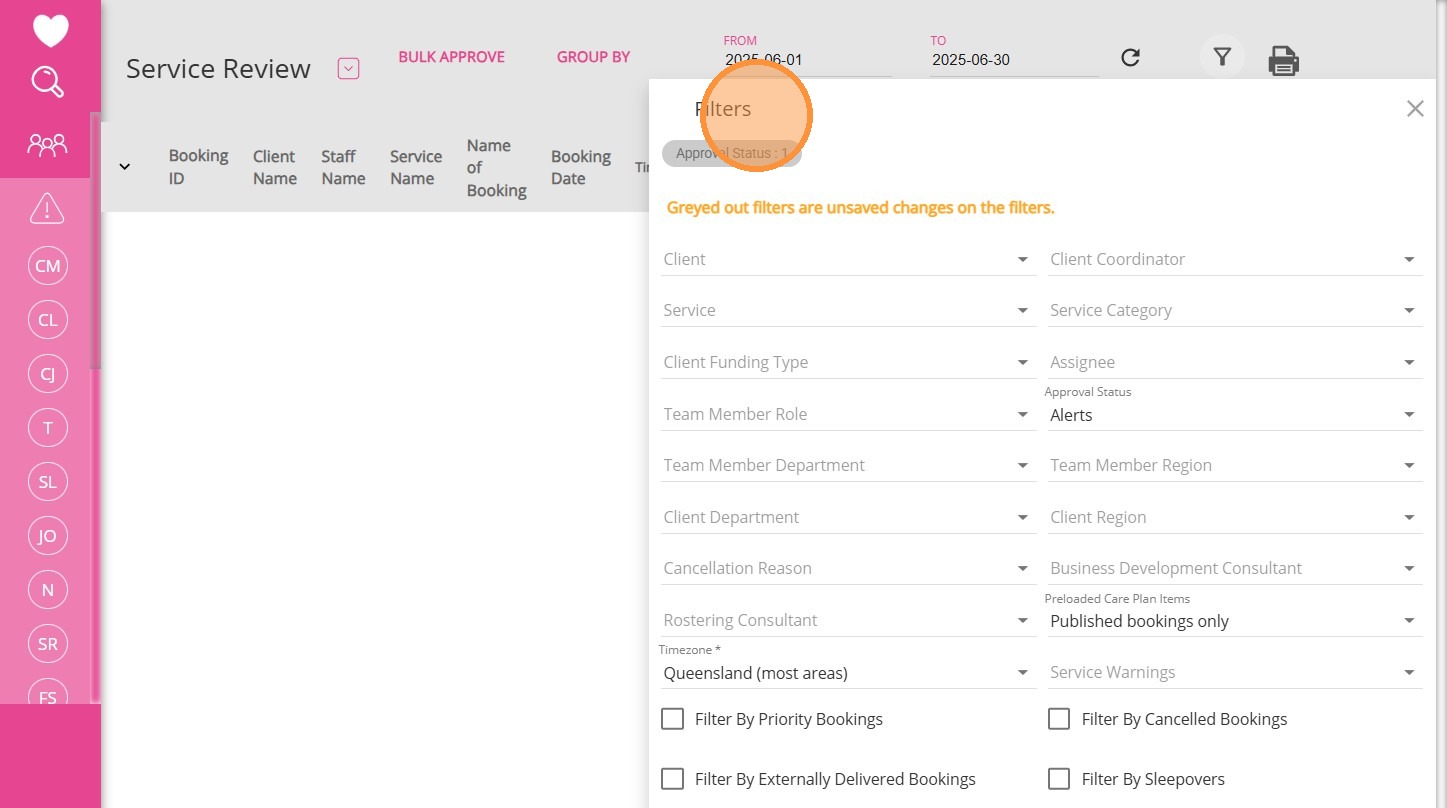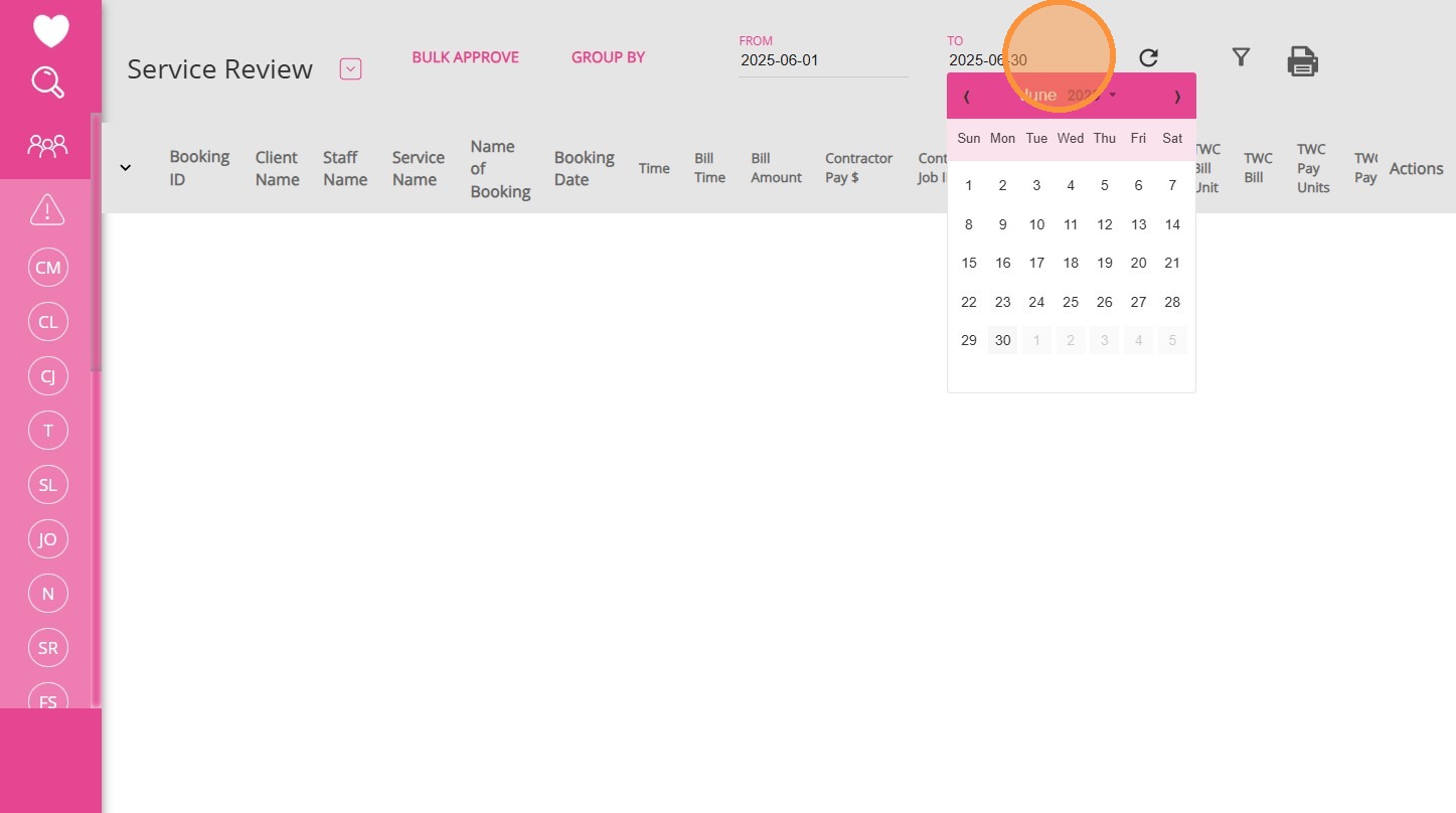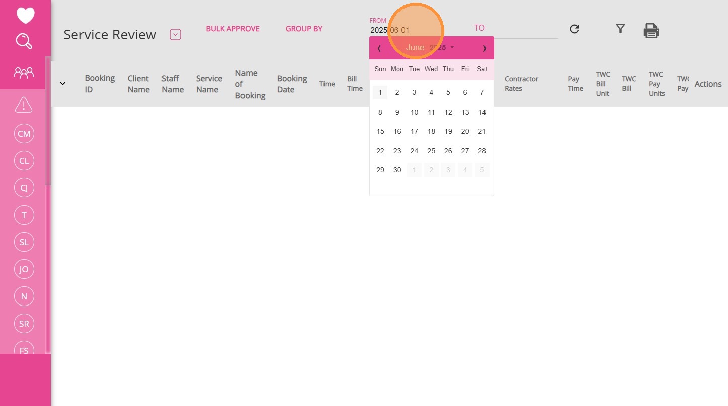 The Service Review Board is a tool that displays all your service bookings within a selected timeframe. It helps teams review, validate, and approve bookings before moving forward with billing and claiming. By default, it shows only items that are not yet approved, so you can quickly identify bookings needing attention.