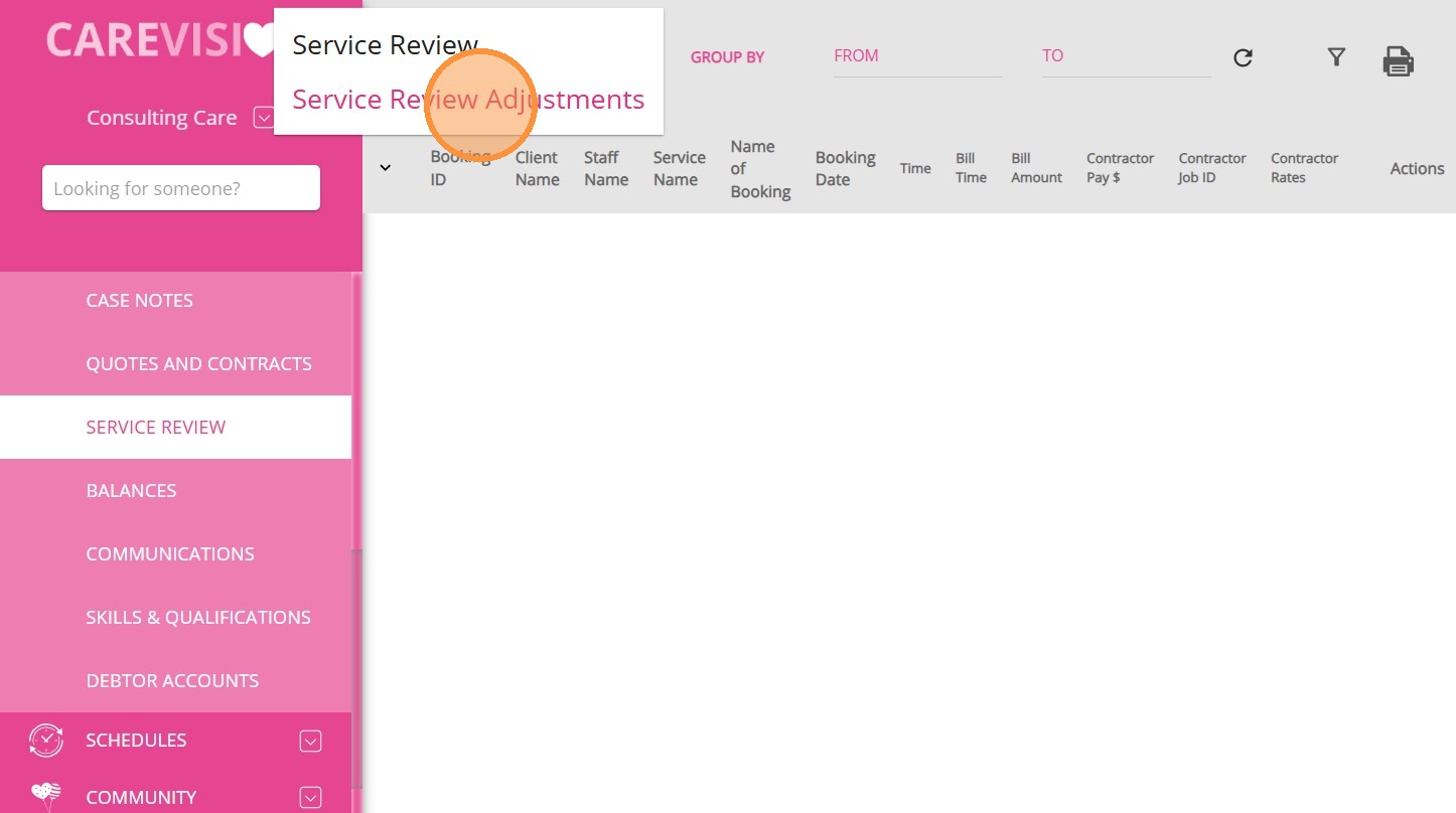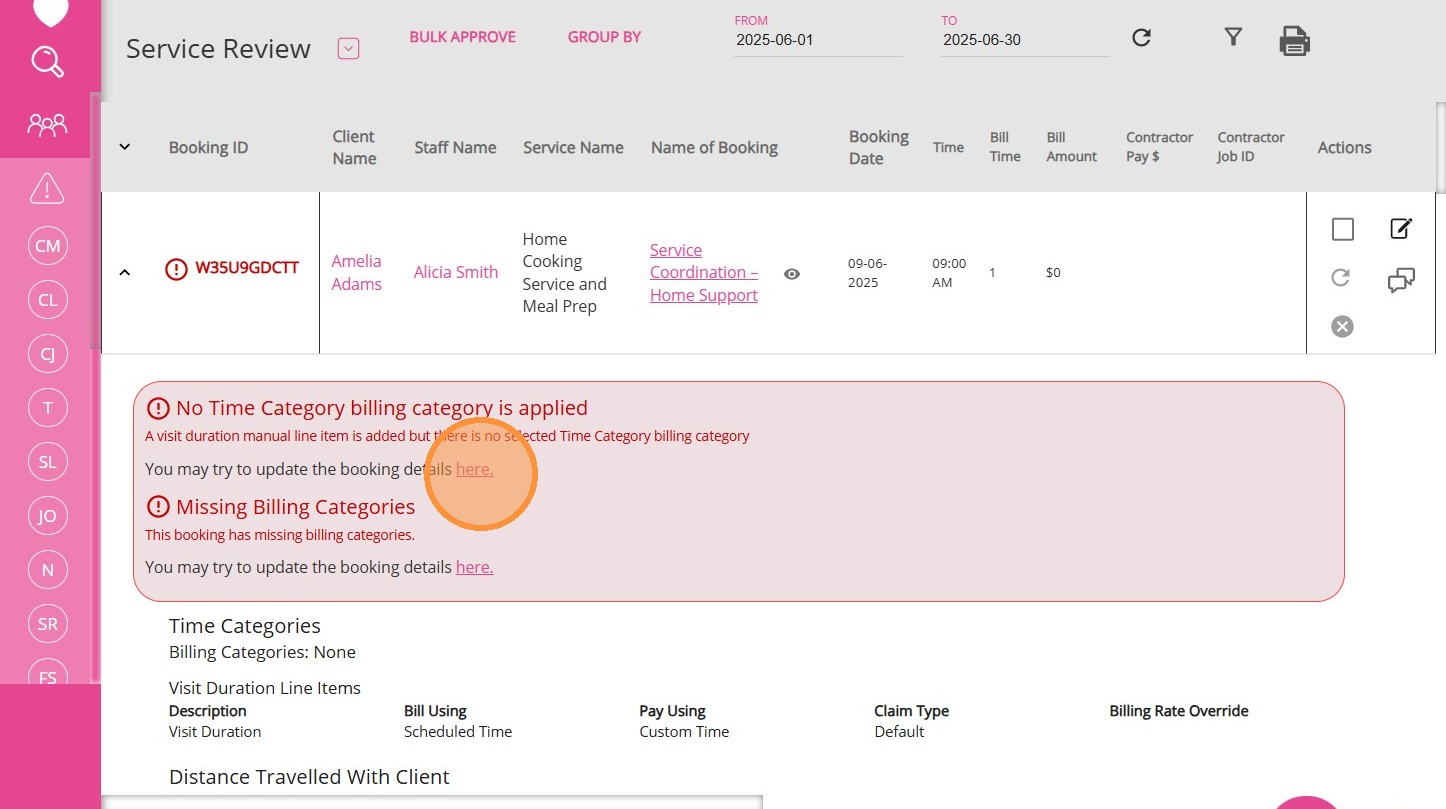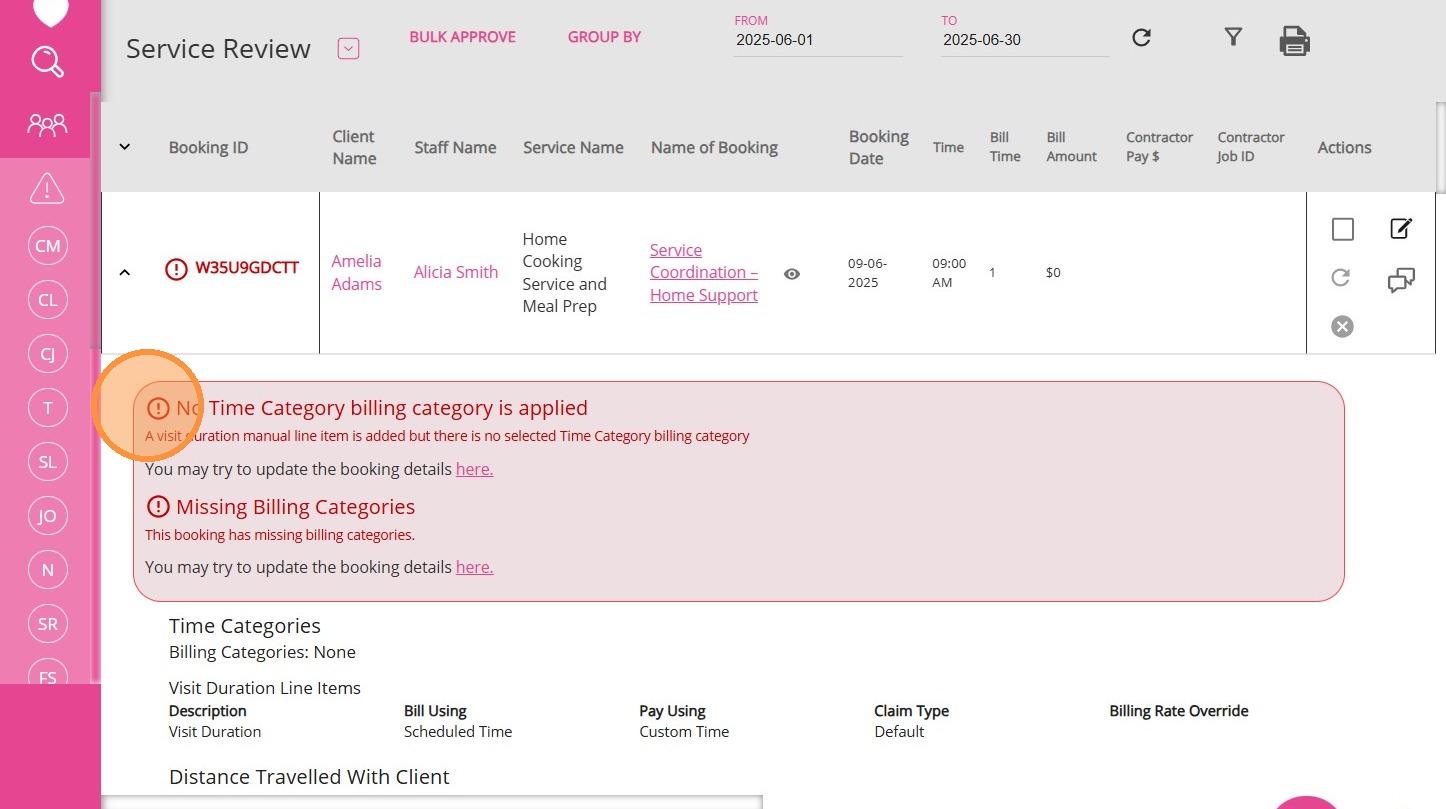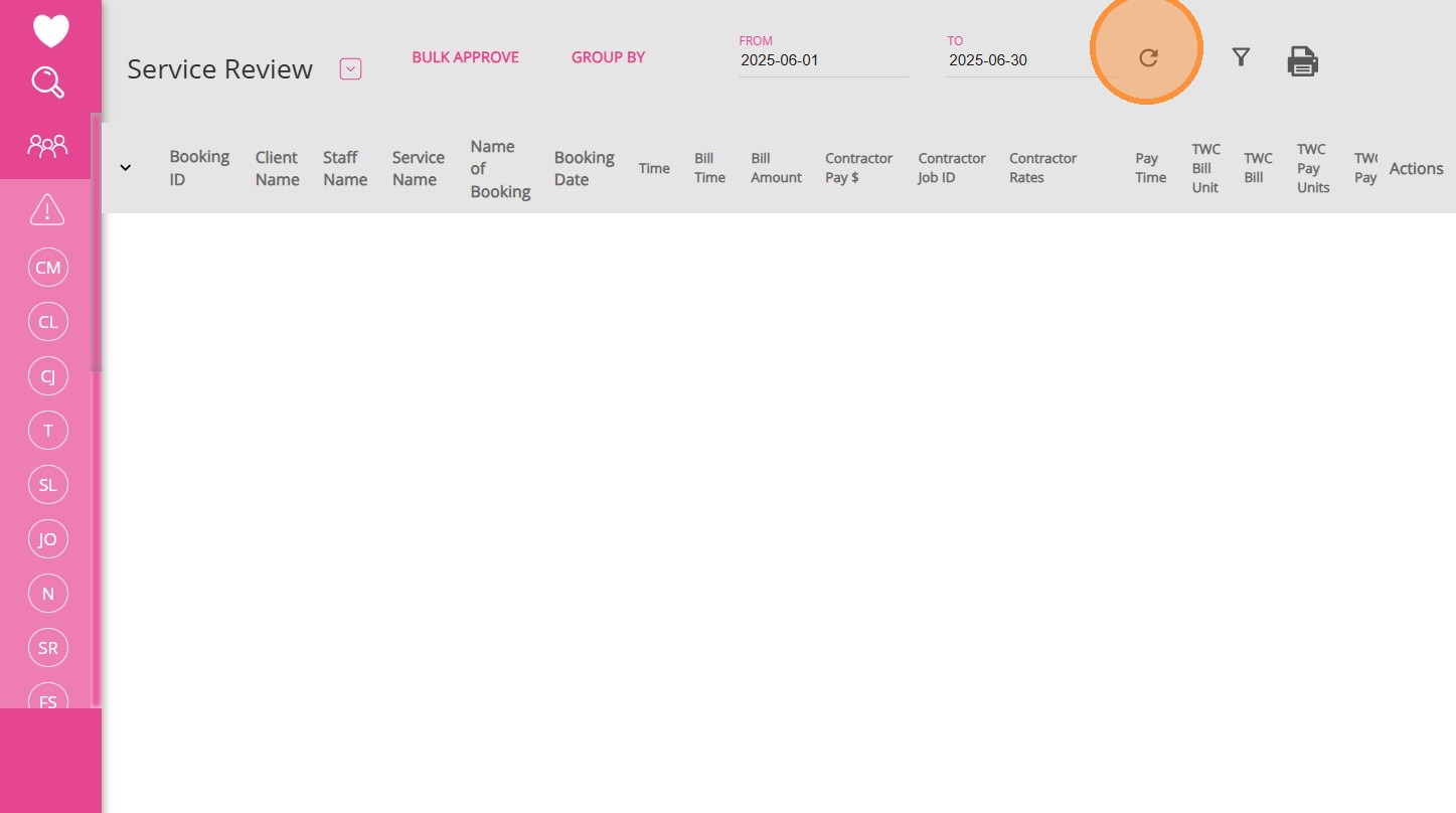 The Service Review Board is a tool that displays all your service bookings within a selected timeframe. It helps teams review, validate, and approve bookings before moving forward with billing and claiming. By default, it shows only items that are not yet approved, so you can quickly identify bookings needing attention.