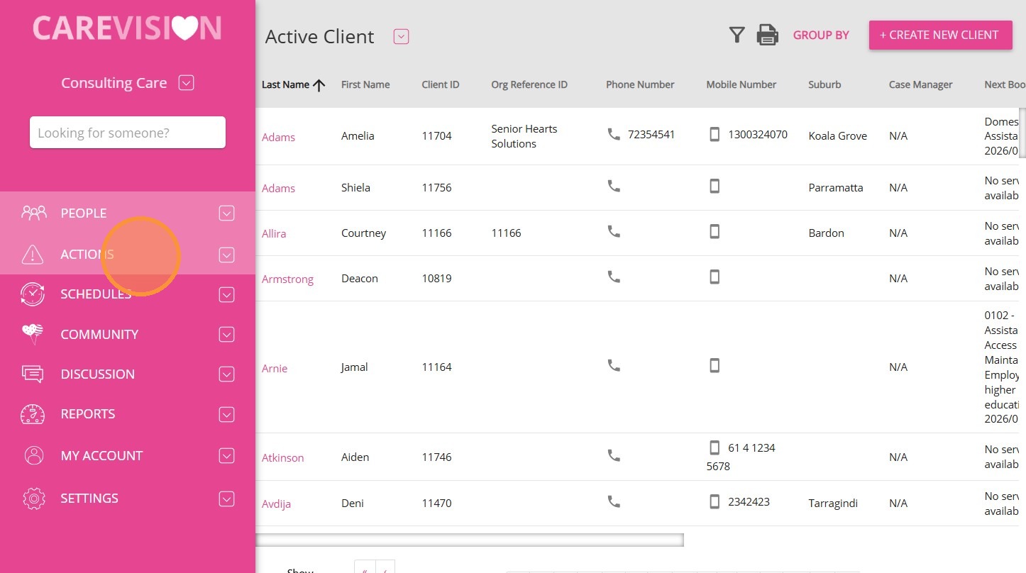 Service Review is a section in the left navigation pane of the CareVision portal, found under Actions > Service Review. In this section, teams handle all service processing and approvals. Users often refer to this area as the Service Review Board or Service Review Action Board.