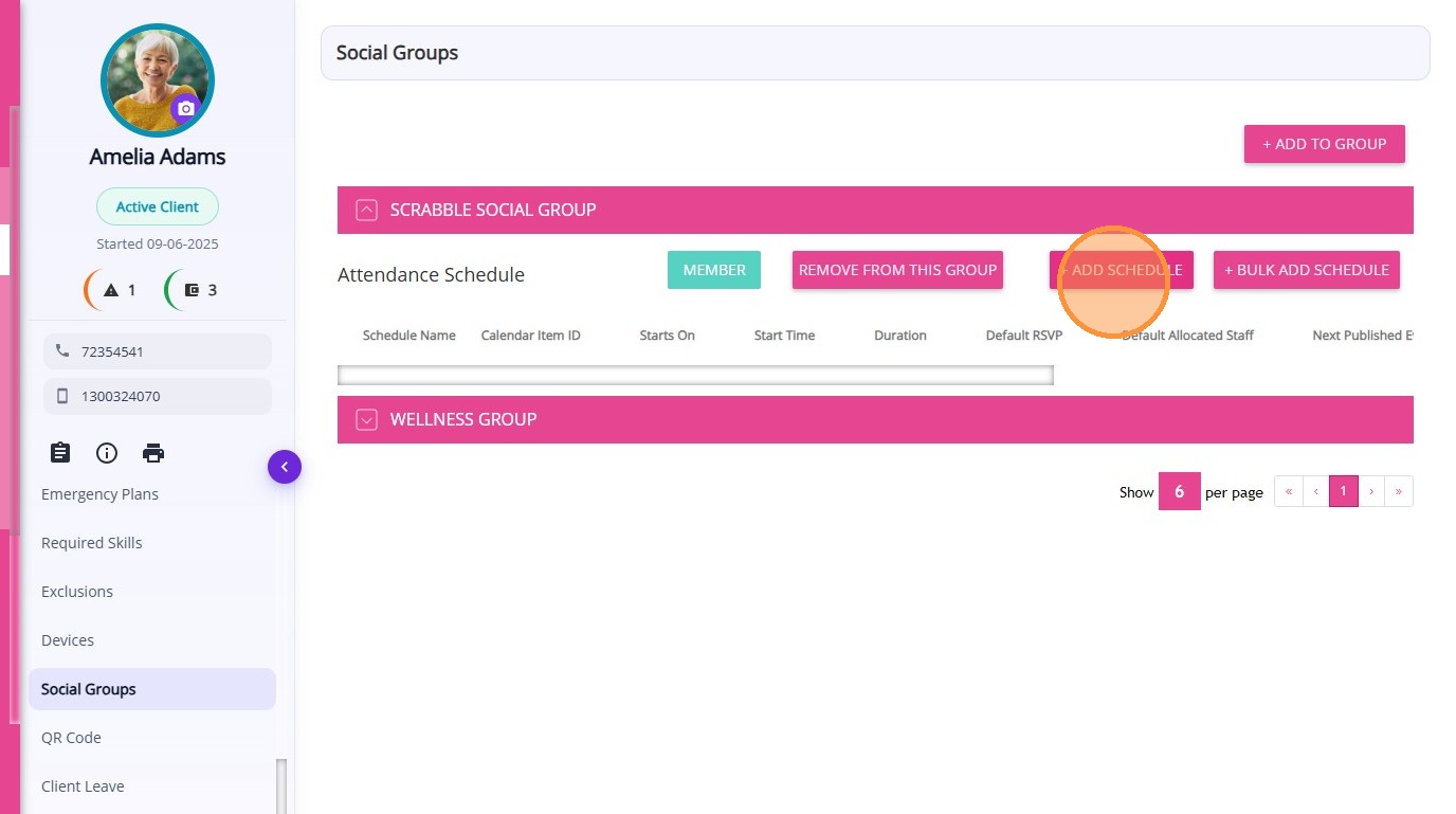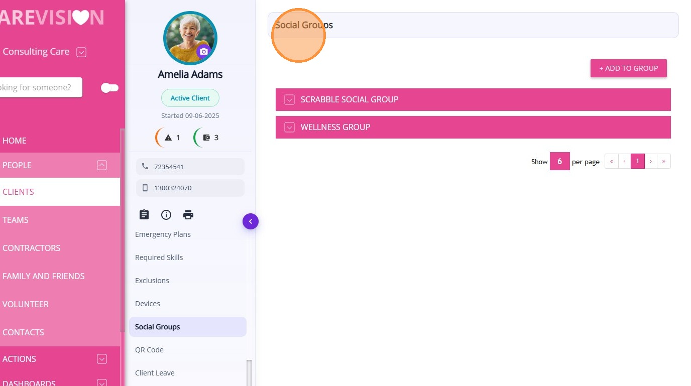 The Social Groups section in the Client Profile displays all social groups associated with the client. This allows coordinators and staff to view and manage the social groups a client belongs to.