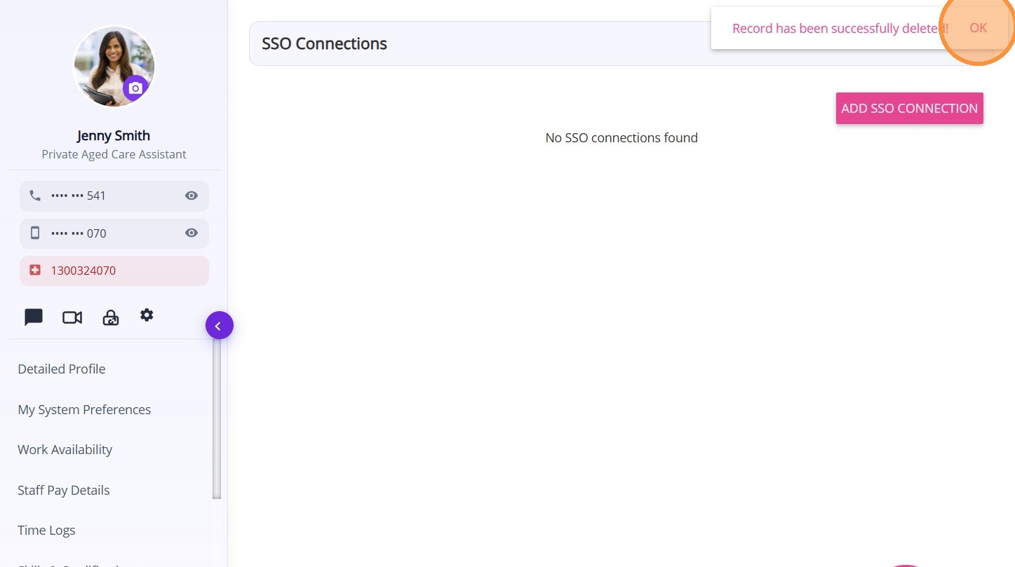 6. Click OK when the confirmation message appears. The staff member’s SSO connection is now removed.