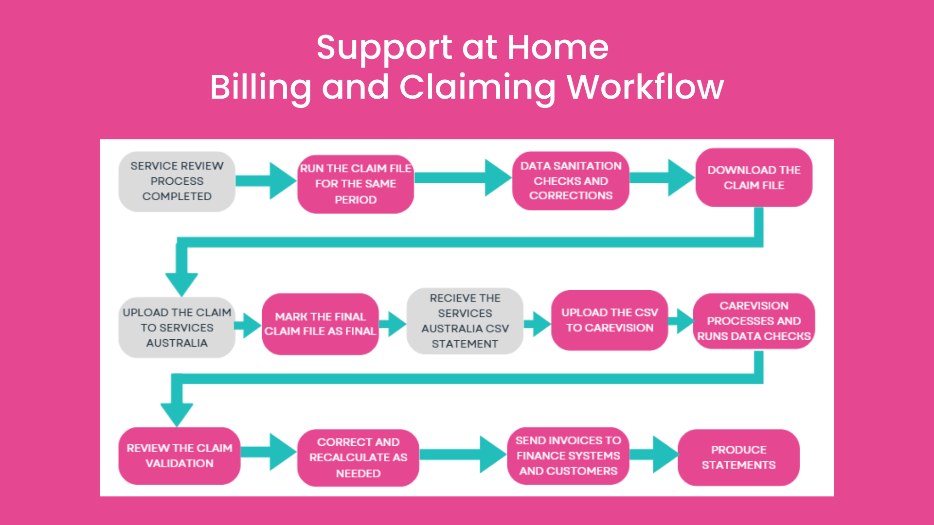 Keywords: support at home billing, carevision claiming process, sah claim file, services australia upload, data sanitation checks, carevision export steps, claim validation carevision, services australia csv, invoice generation carevision, client statements carevision