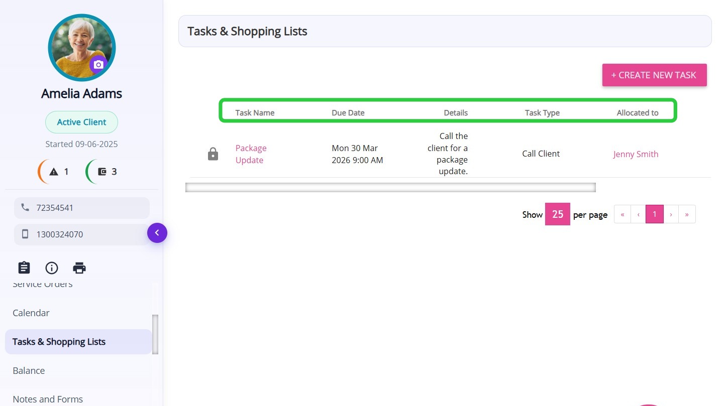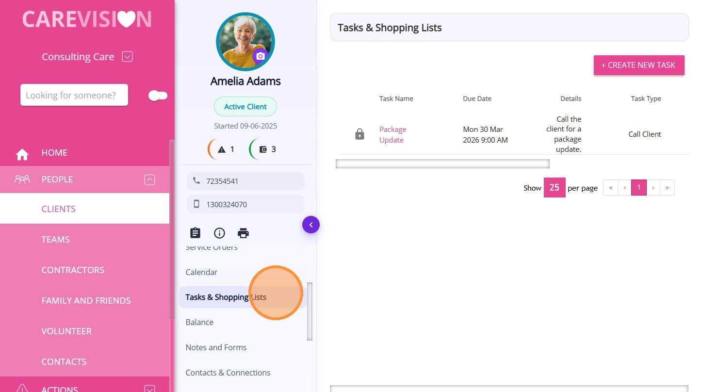The Tasks & Shopping Lists section allows users to create and manage tasks related to a specific client. These tasks help staff track reminders, administrative actions, and follow‑ups that need to be completed outside of scheduled services.