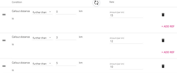 The Conditional Type of Callout Distance only applies 1 rate depending on the total distance. Users set up rules with comparison operators for the distance that is "further than", "further than or equal to", "shorter than", and "shorter than or equal to" a certain number. According to the rules below, if the total Callout Distance is 10km, the total fees will be 10*$10 = $100; if the distance is 4km, the total fees will be 4*$12 = $48.