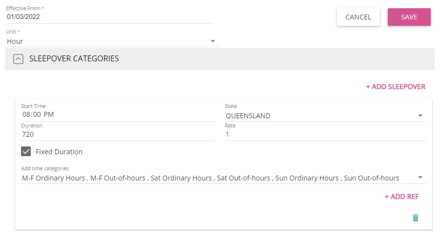 Sleepover Billing Categories are designed to be used in conjunction with Time Category Billing Categories. The Time Category billing category is applied for time outside of (before or after) the sleepover period.